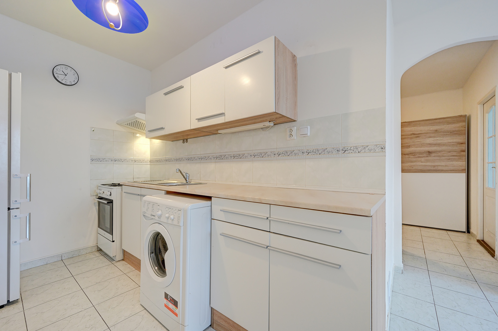 Bytovou jednotku tvoří neprůchozí ložnice, obývací pokoj s kuchyňským koutem, koupelna s vanou a toaletou, chodba se šatní skříní a komora, umístěná na společné domovní chodbě na patře hned vedle bytu. Kuchyňská linka je vybavená el. troubou, plyn. sporákem, digestoří, pračkou a lednicí s mrazákem. Orientace bytu na jih s hezkým výhledem na Prahu.