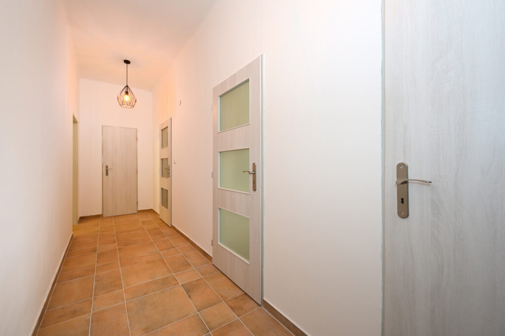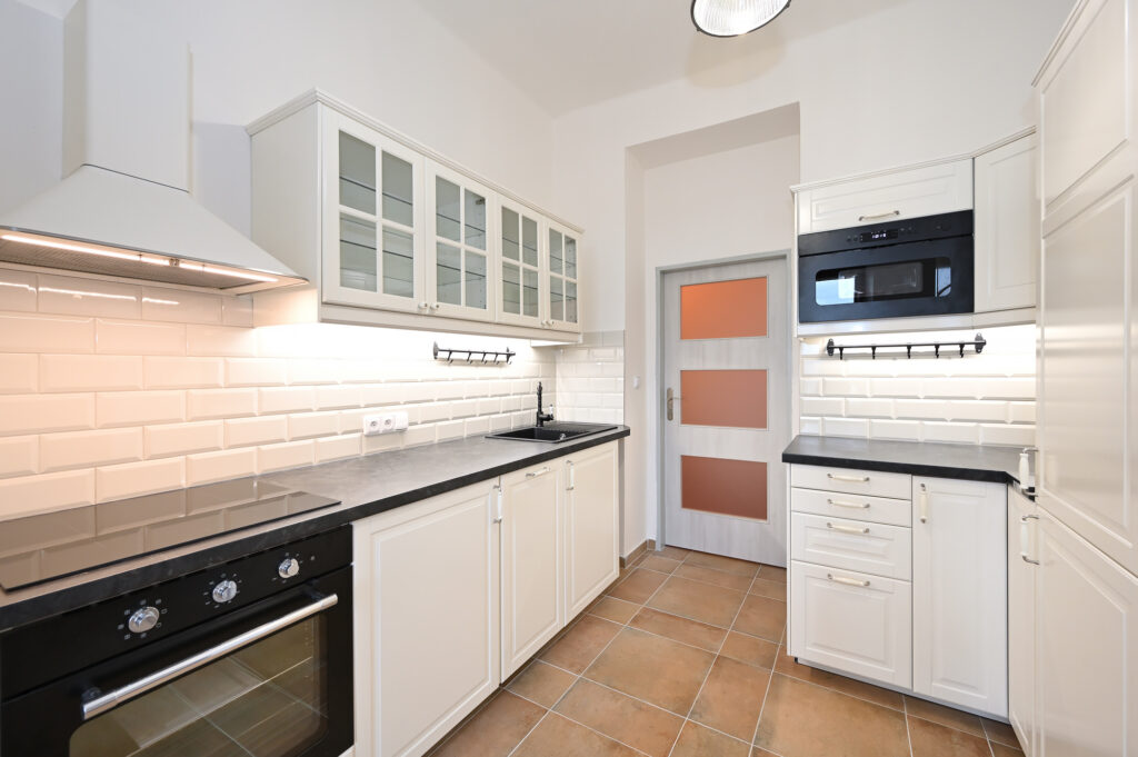Byt prošel velmi zdařilou a nákladnou rekonstrukcí, která přesáhla částku 1 mil. Kč. Bytová jednotka se skládá ze vstupní chodby, obývacího pokoje, kuchyně, ložnice, koupelny se sprchovým koutem, samostatné toalety a komory. Kuchyně je zařízená kvalitními spotřebiči (vestavěná lednice s mrazákem, el. trouba, varná deska, digestoř, myčka, mikro. trouba a pračka). V obývacím pokoji (jídelní stůl s židlemi, rozkládací sedací souprava a stoleček s TV). V ložnici (manželská postel a velká šatní skříň). Ložnice je orientována do klidné ulice a obývací pokoj do vnitrobloku s nádherným výhledem na Prahu.