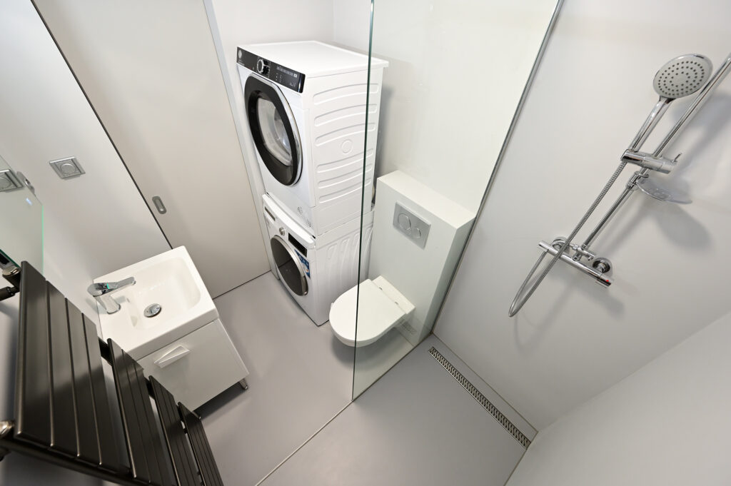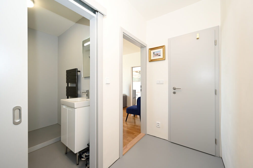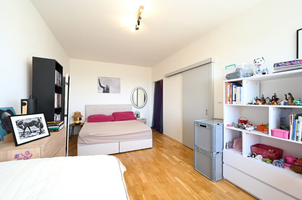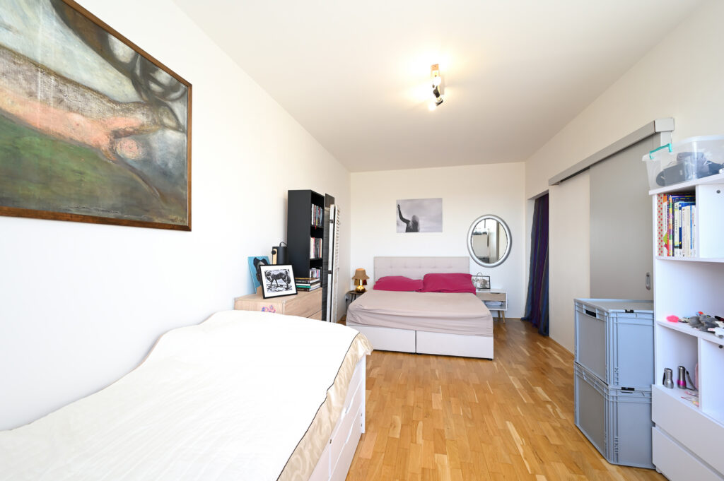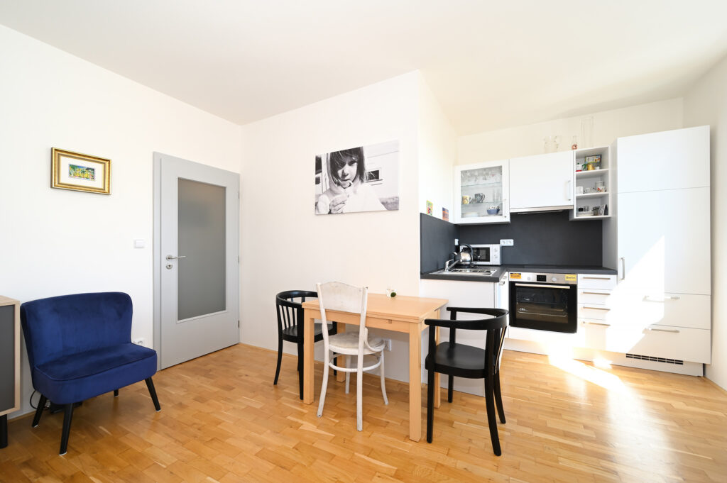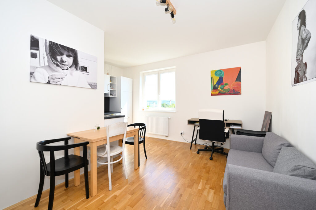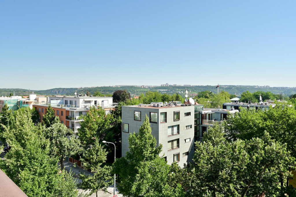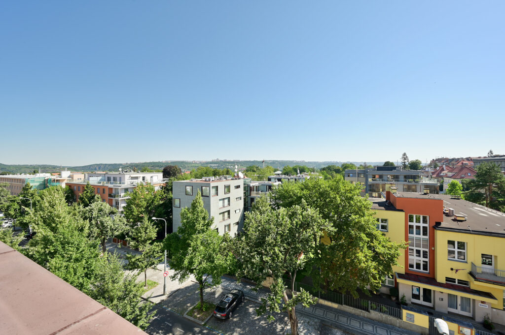 Byt se skládá ze vstupní chodby s menší komorou, koupelny se sprchovým koutem a toaletou, obývacího pokoje s kuchyňským koutem a ložnicí s šatnou. Byt se pronajímá částečně zařízený, moderní kuchyňská linka s vestavěnými spotřebiči (varná deska, el. trouba, digestoř, myčka, lednice s mrazákem a mikrovlnná trouba), v obývacím pokoji rozkládací sedací souprava, v ložnici komoda, v předsíni botník, v koupelně pračka se sušičkou, topný žebřík, vyhřívaná podlaha (ostatní vybavení bytu není součástí pronájmu). Vytápění a ohřev teplé vody přes vlastní plynový kotel. V obývacím pokoji a ložnici hezké renovované parkety, vstupní chodba a koupelna litá stěrka. Orientace bytu na jihovýchod s krásným výhledem na Prahu.
