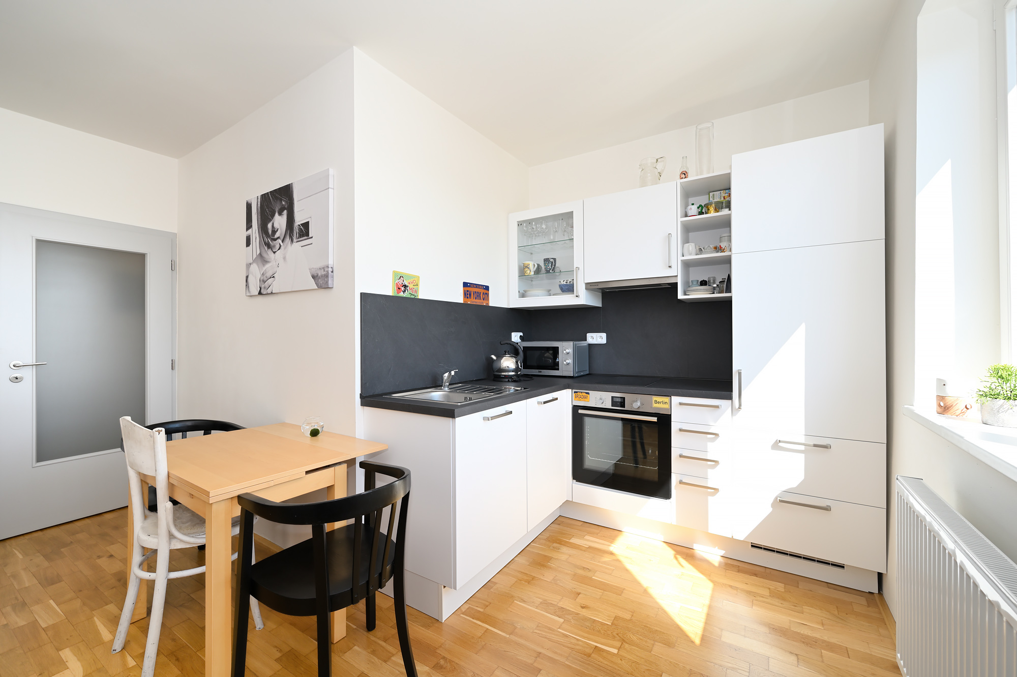 Byt se skládá ze vstupní chodby s menší komorou, koupelny se sprchovým koutem a toaletou, obývacího pokoje s kuchyňským koutem a ložnicí s šatnou. Byt se pronajímá částečně zařízený, moderní kuchyňská linka s vestavěnými spotřebiči (varná deska, el. trouba, digestoř, myčka, lednice s mrazákem a mikrovlnná trouba), v obývacím pokoji rozkládací sedací souprava, v ložnici komoda, v předsíni botník, v koupelně pračka se sušičkou, topný žebřík, vyhřívaná podlaha (ostatní vybavení bytu není součástí pronájmu). Vytápění a ohřev teplé vody přes vlastní plynový kotel. V obývacím pokoji a ložnici hezké renovované parkety, vstupní chodba a koupelna litá stěrka. Orientace bytu na jihovýchod s krásným výhledem na Prahu.