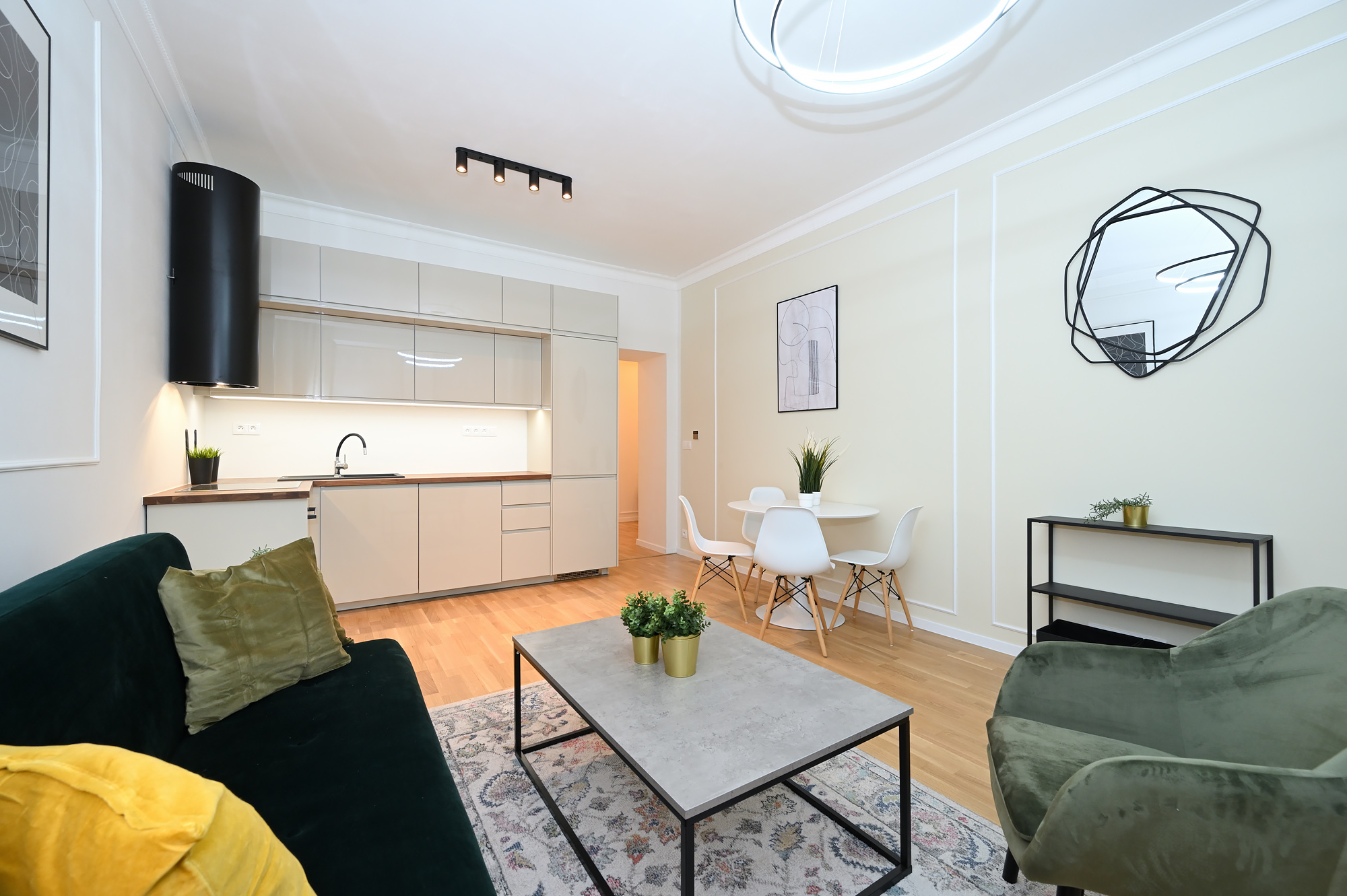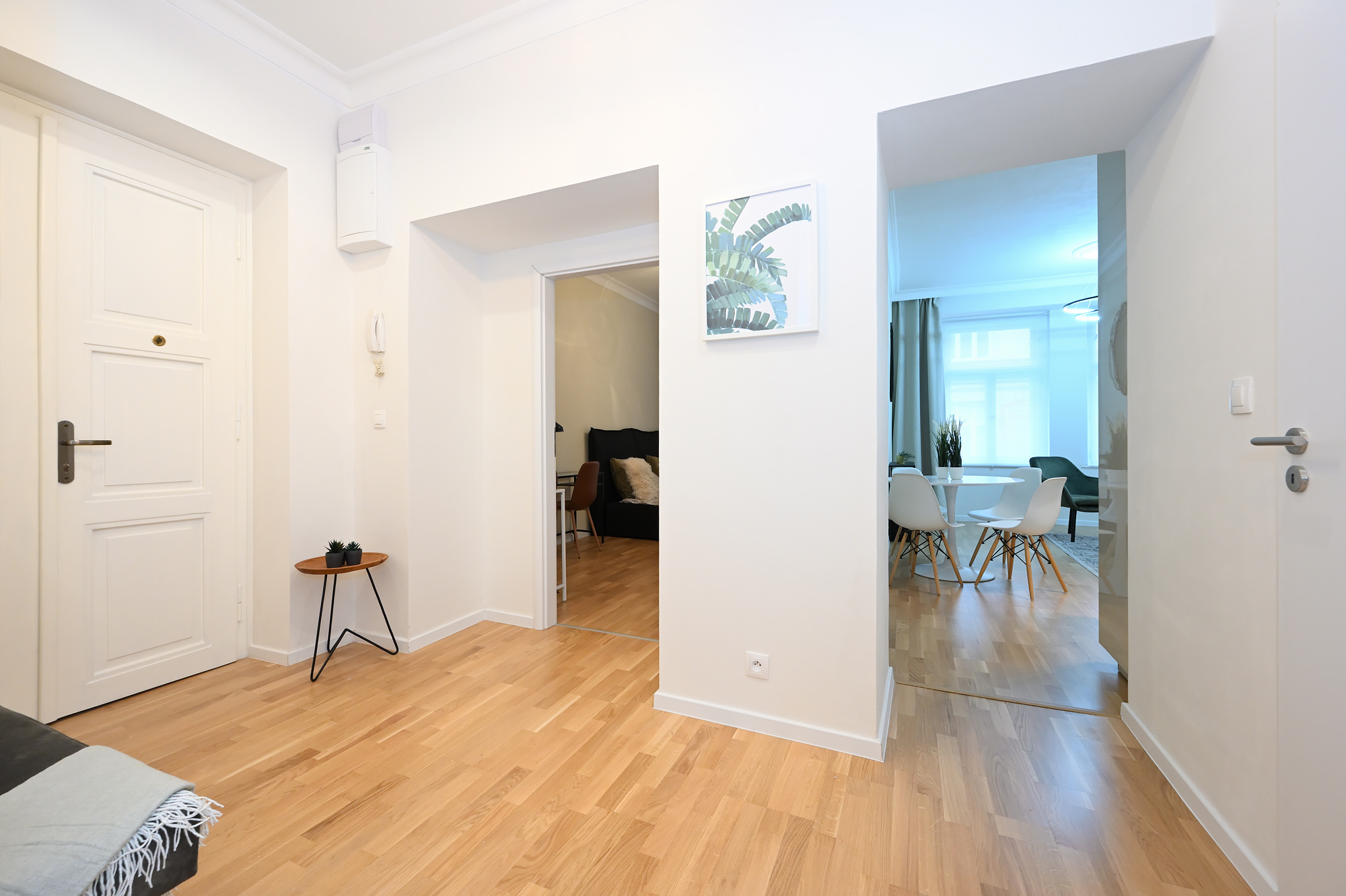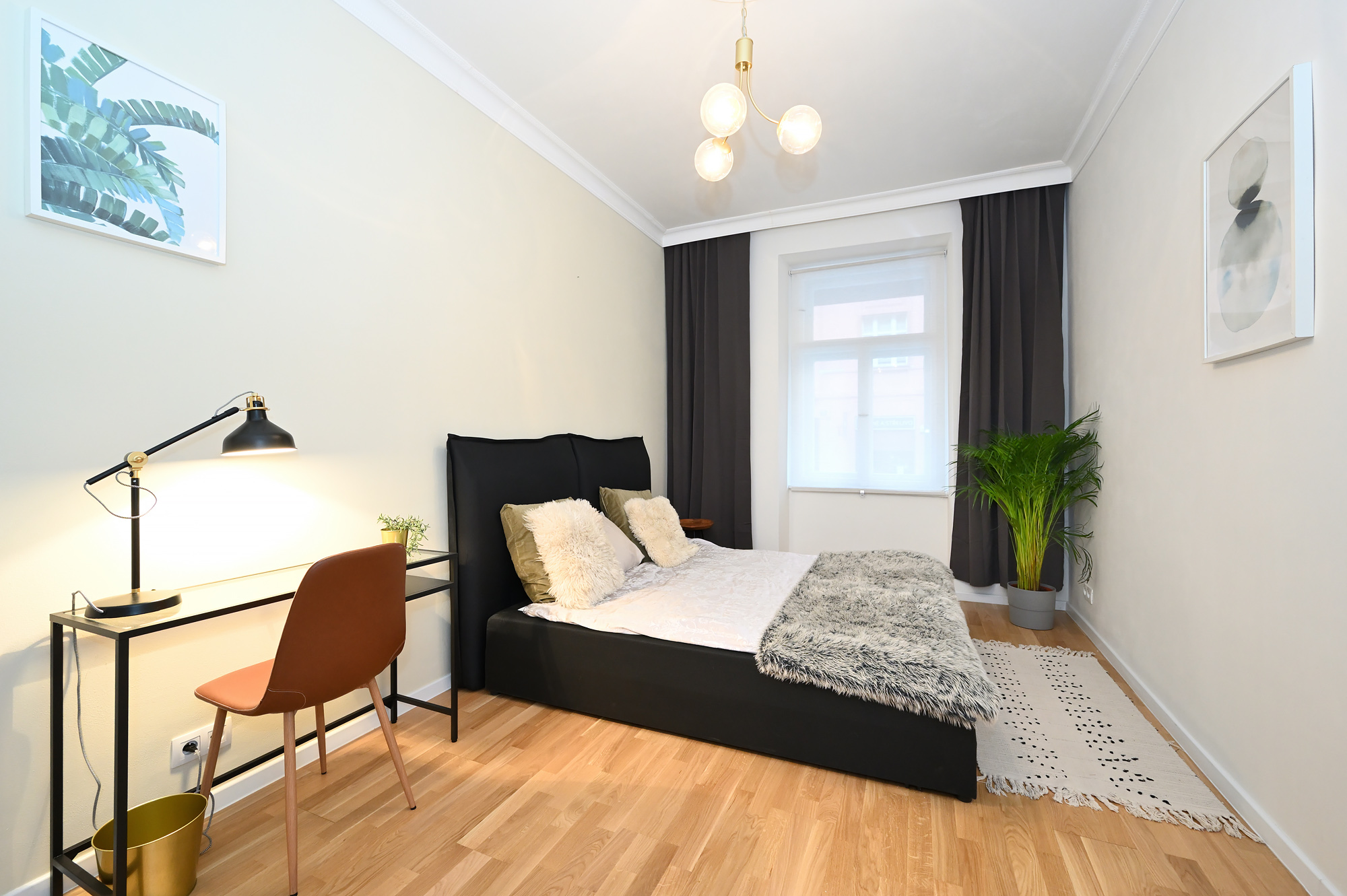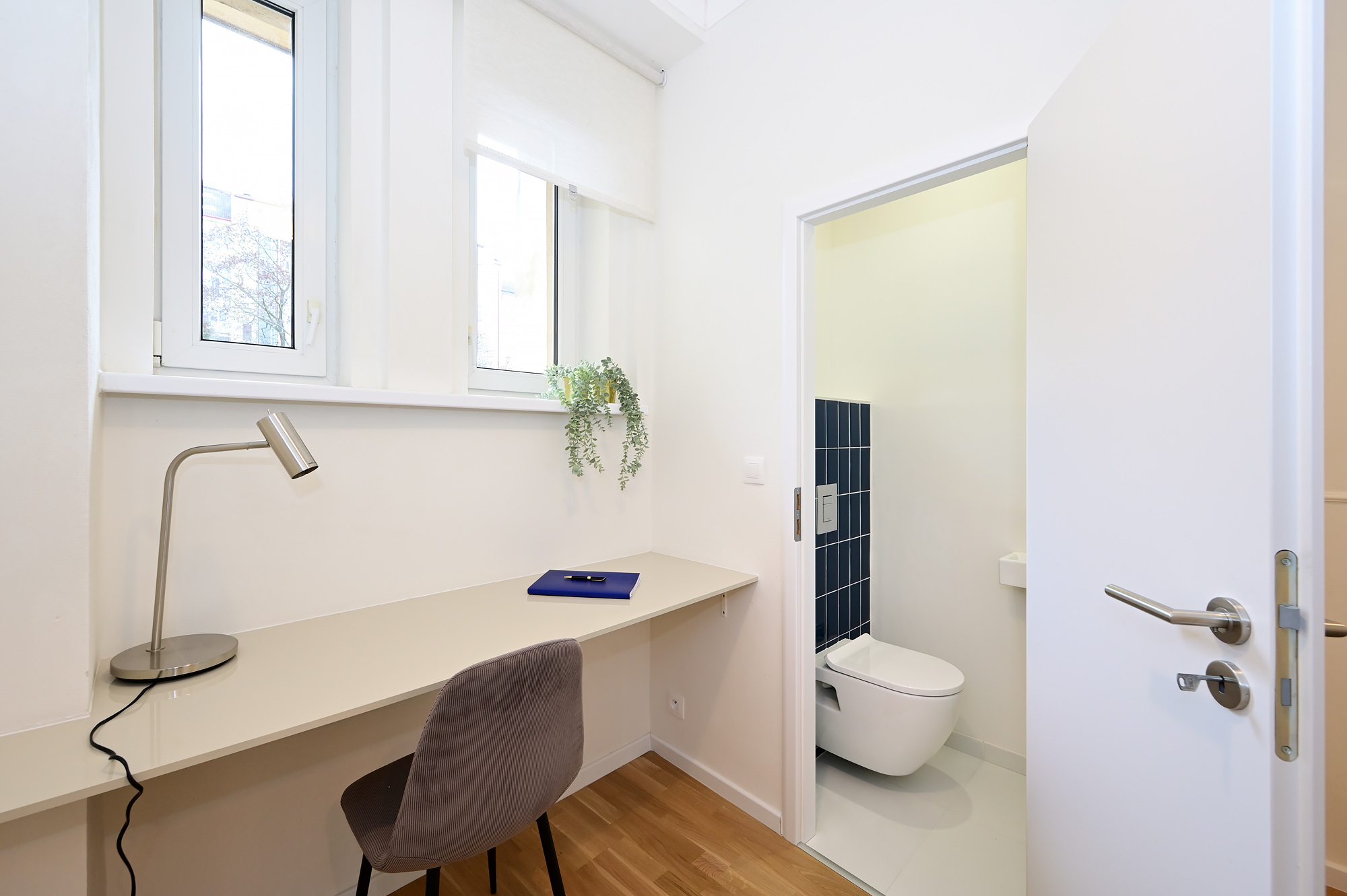 V bytě se nachází velký obývací pokoj s kuchyňským koutem, vybaveným novou linkou se značkovými spotřebiči. Dále byt disponuje prostornou ložnicí (18,5 m2) orientovanou do klidné zahrady ve vnitrobloku. Dále se v bytě nachází velký neprůchozí pokoj (16 m2) a druhý samostatný pokoj (10 m2) s WC, který může sloužit jako dětský pokoj, pracovna či pokoj pro hosty. V bytě naleznete moderní koupelnu se sprchovým koutem a toaletou.