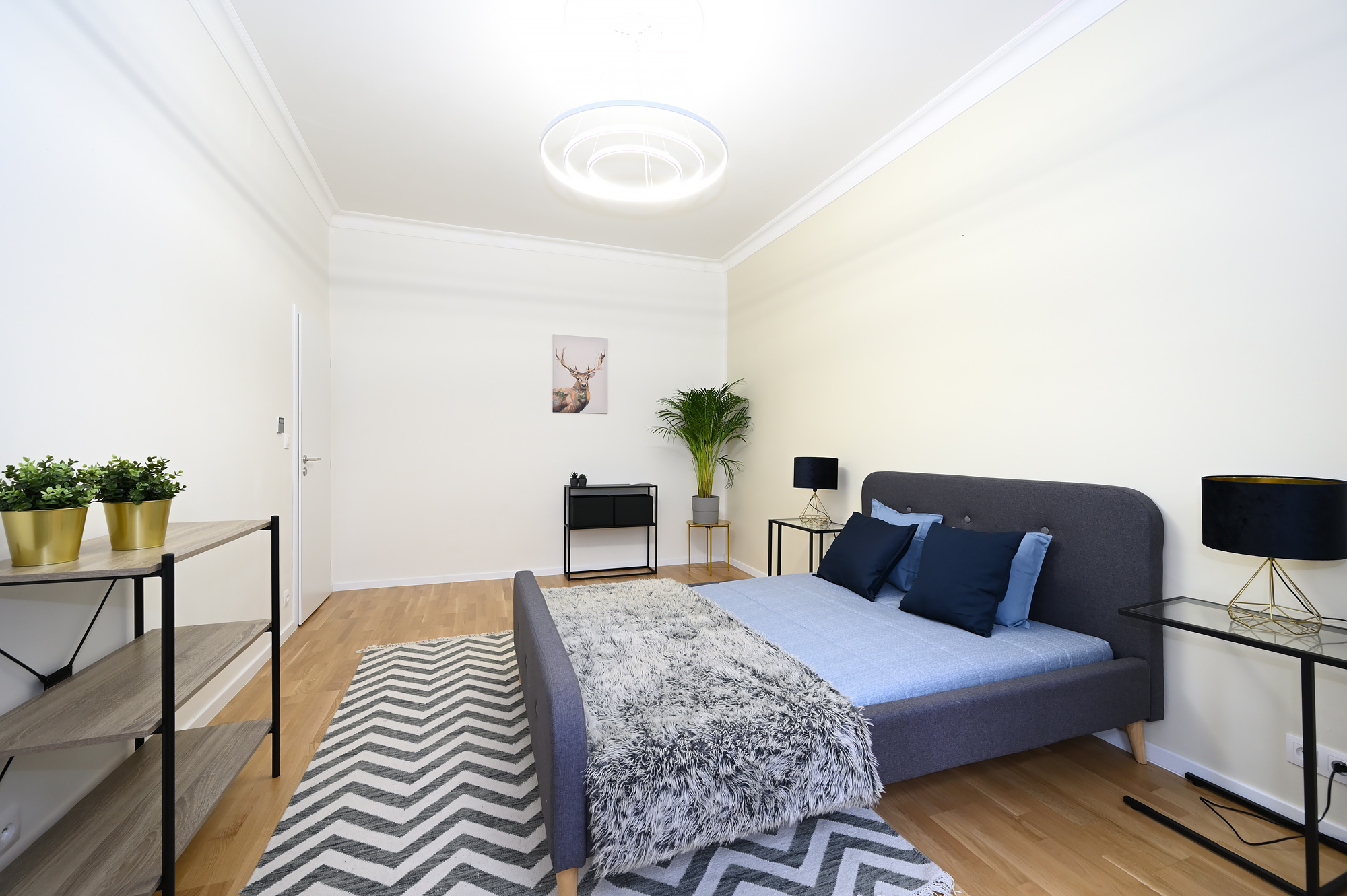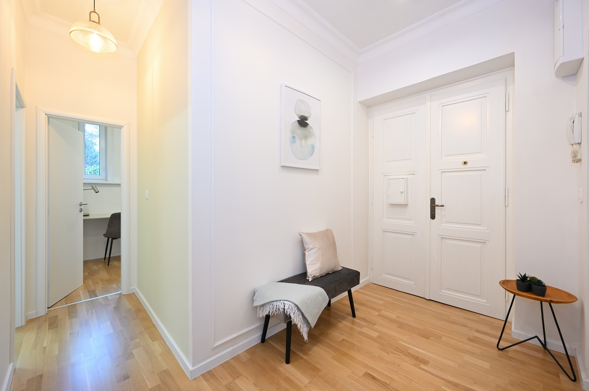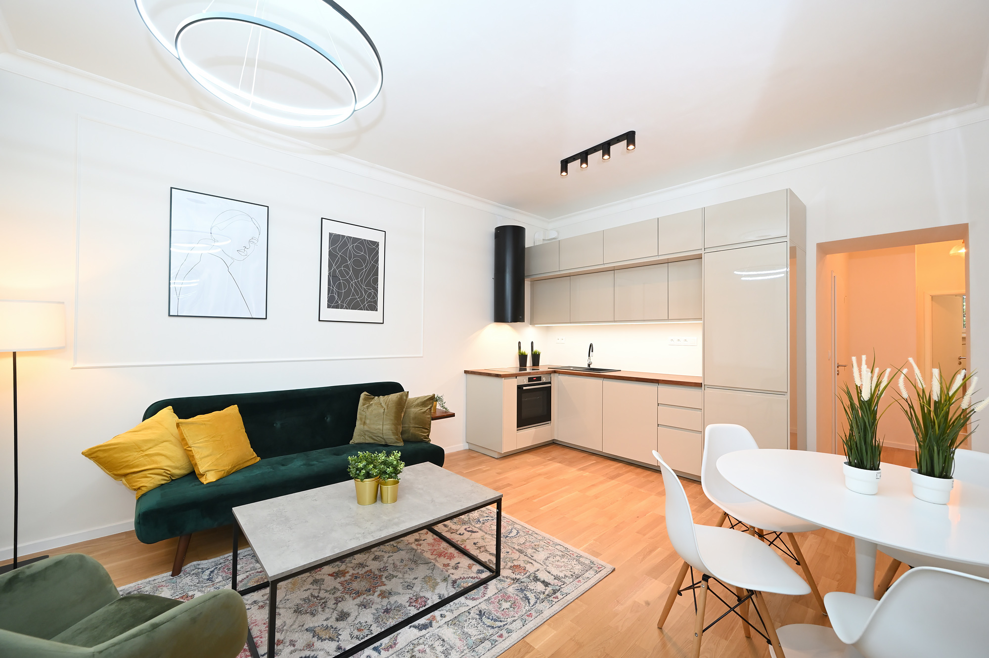 V bytě se nachází velký obývací pokoj s kuchyňským koutem, vybaveným novou linkou se značkovými spotřebiči. Dále byt disponuje prostornou ložnicí (18,5 m2) orientovanou do klidné zahrady ve vnitrobloku. Dále se v bytě nachází velký neprůchozí pokoj (16 m2) a druhý samostatný pokoj (10 m2) s WC, který může sloužit jako dětský pokoj, pracovna či pokoj pro hosty. V bytě naleznete moderní koupelnu se sprchovým koutem a toaletou.