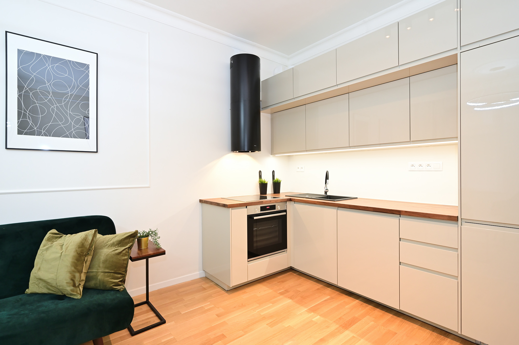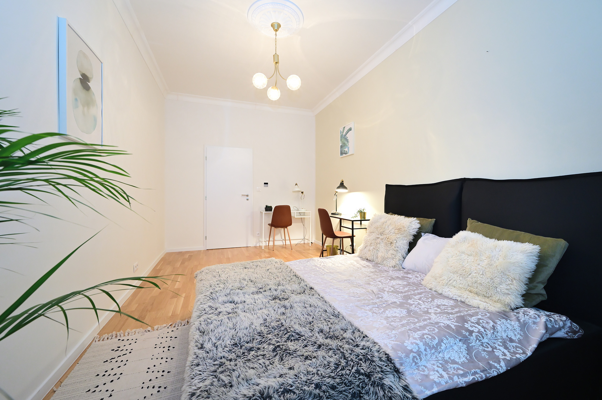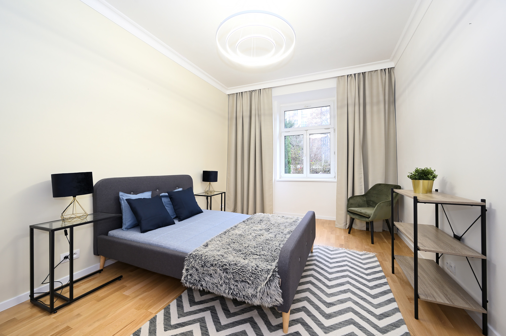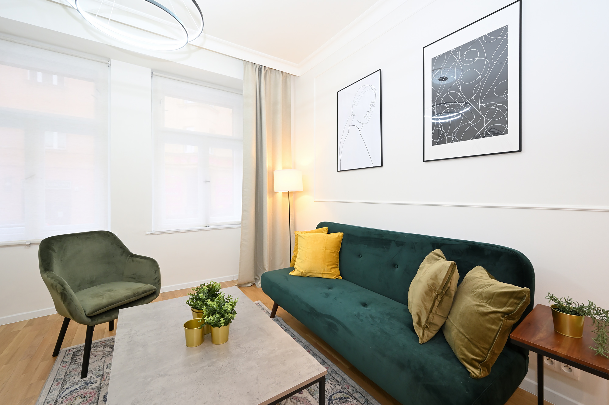 V bytě se nachází velký obývací pokoj s kuchyňským koutem, vybaveným novou linkou se značkovými spotřebiči. Dále byt disponuje prostornou ložnicí (18,5 m2) orientovanou do klidné zahrady ve vnitrobloku. Dále se v bytě nachází velký neprůchozí pokoj (16 m2) a druhý samostatný pokoj (10 m2) s WC, který může sloužit jako dětský pokoj, pracovna či pokoj pro hosty. V bytě naleznete moderní koupelnu se sprchovým koutem a toaletou.