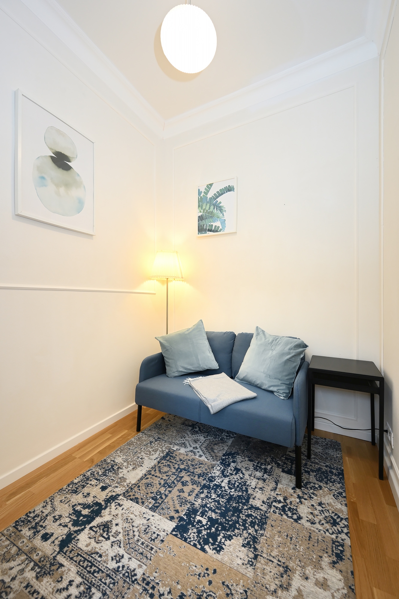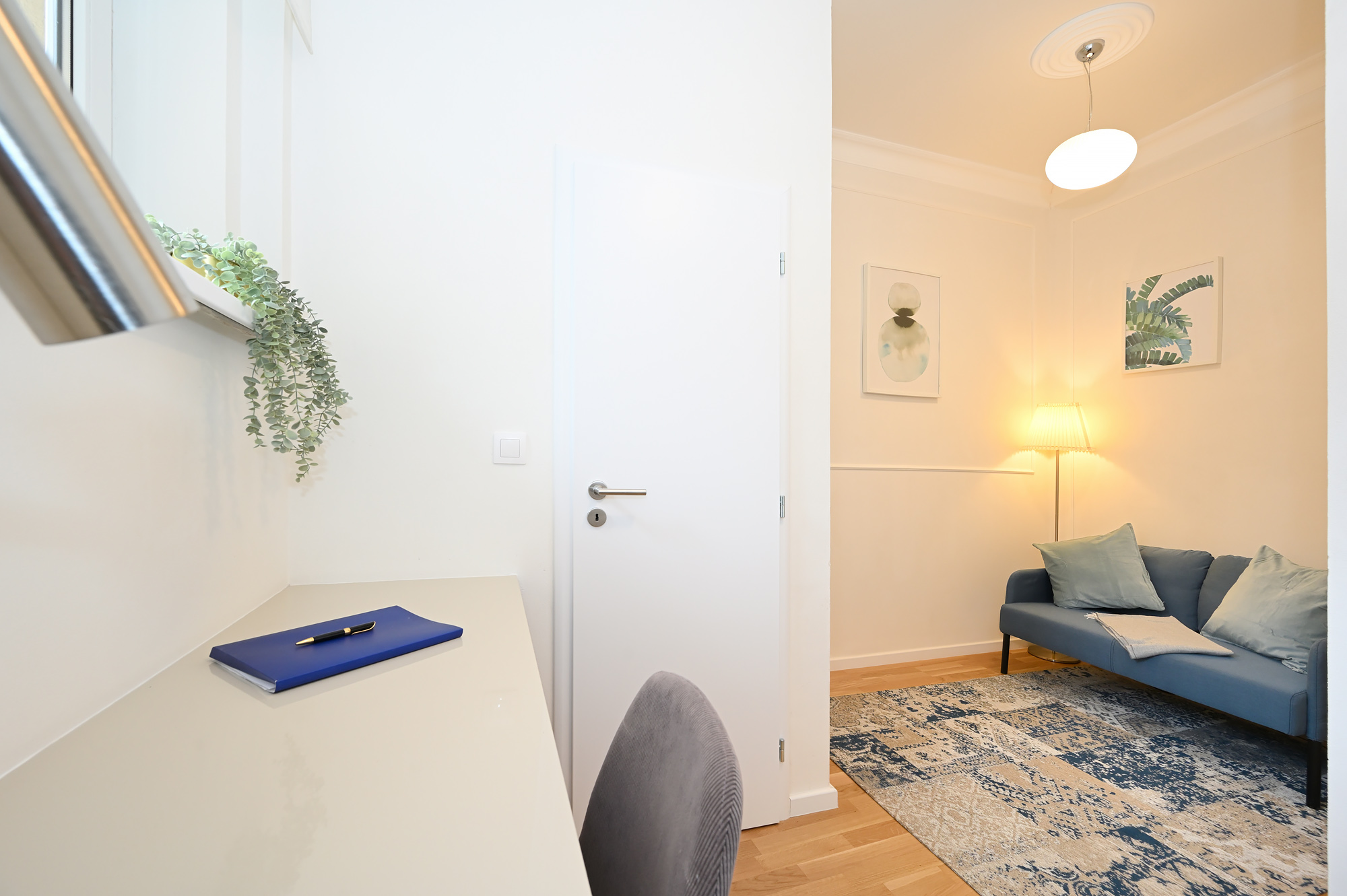 Nabízím vám zcela nově zrekonstruovaný a kompletně zařízený byt 3+kk s pracovnou (nebo malou ložnicí), 80 m2, který se nachází ve zvýšeném přízemí domu, kde je parapet oken do ulice ve výšce 2,1 metru nad úrovní chodníku a jeho druhá strana je orientována do klidného vnitrobloku.