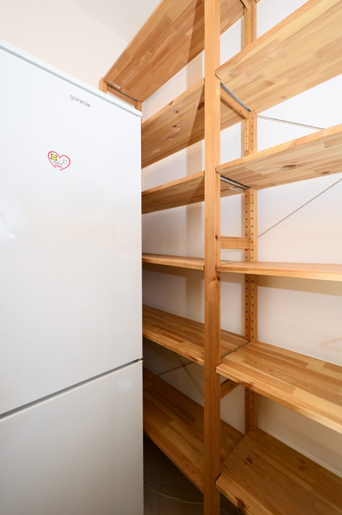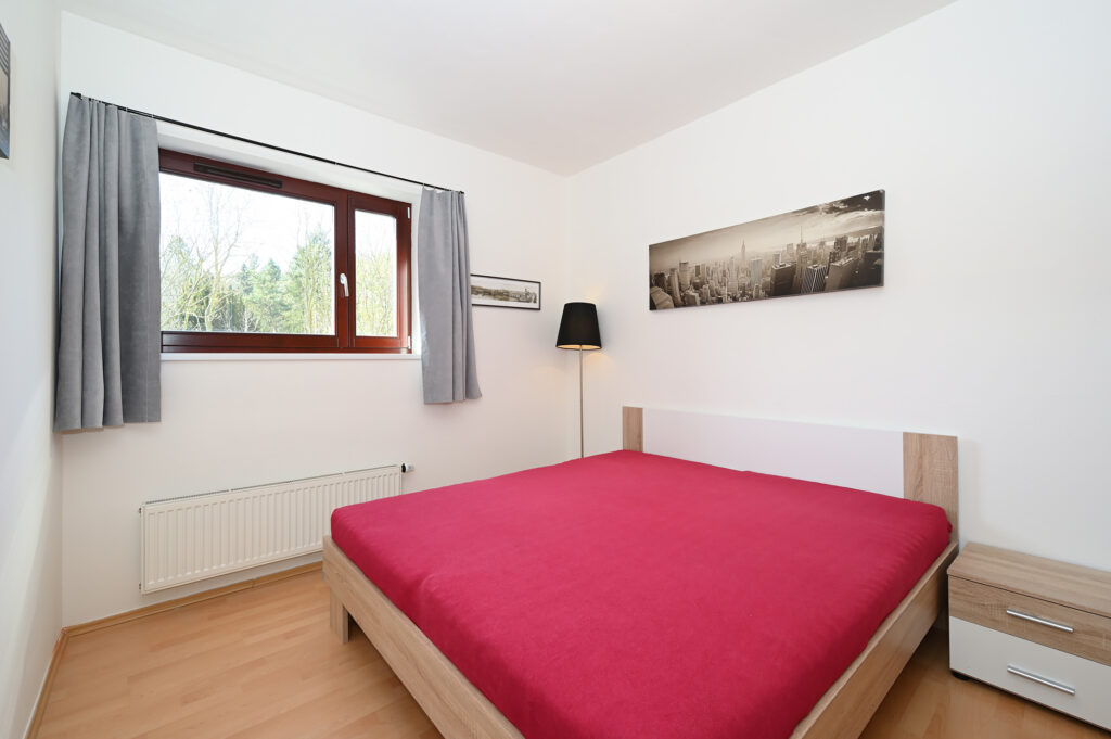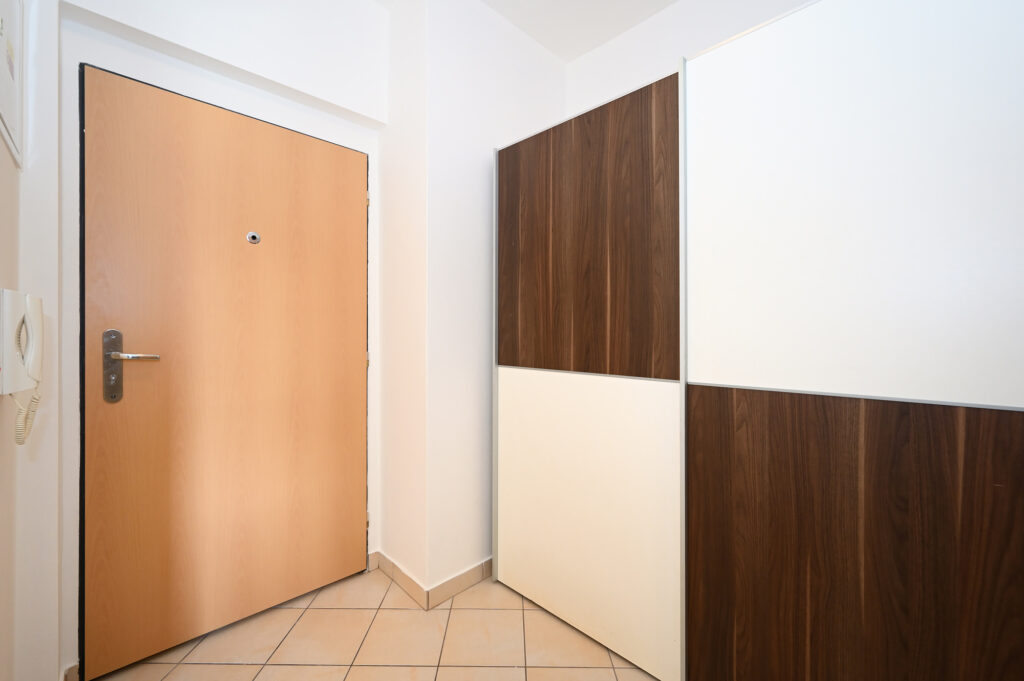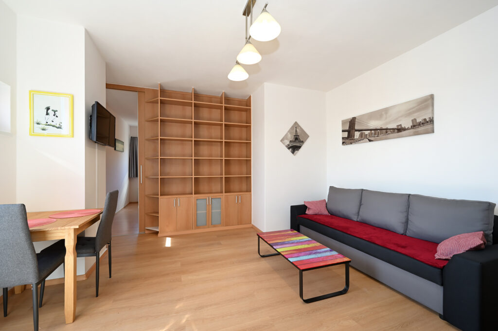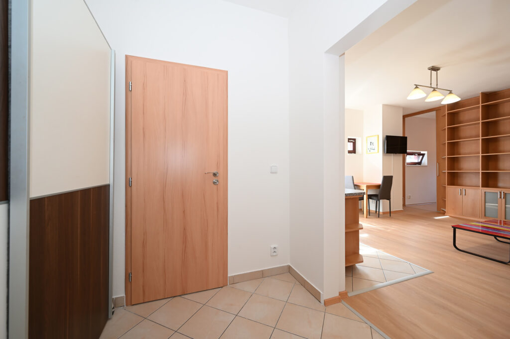Byt se skládá z předsíně, koupelny s vanou a toaletou (včetně pračky), obývacího pokoje s kuchyňským koutem, komory a ložnice. Je kompletně zařízený, včetně kuchyňské linky s el. troubou, sklokeramickou varnou deskou, digestoří, myčkou, lednicí s mrazákem a mikrovlnnou troubou. V předsíni se nachází šatní skříň, v obývacím pokoji jídelní stůl s židlemi, rozkládací sedací souprava, konferenční stolek, TV a obývací stěna s policemi. V ložnici je manželská postel a vestavěná šatní skříň.
