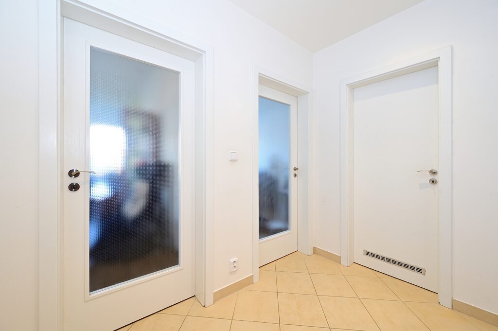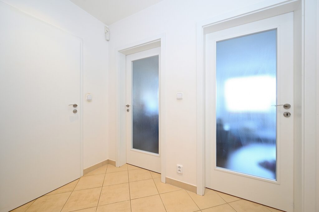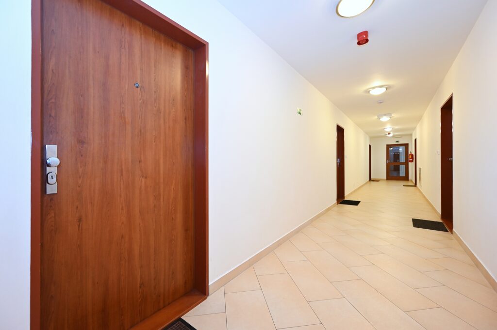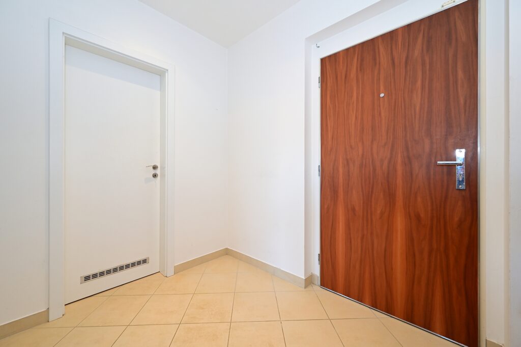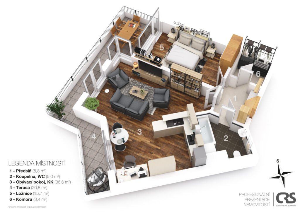 Bytová jednotka zahrnuje předsíň (5.3 m2), komoru (3.4 m2), koupelnu s vanou a toaletou (5 m2), ložnici (15.7 m2) a obývací pokoj s kuchyňským koutem (36.6 m2). Zajímavostí je vstup na terasu ze všech obytných místností. Technický stav bytu je velice dobrý, při výstavbě byly použity kvalitní materiály a jednotlivé prvky.