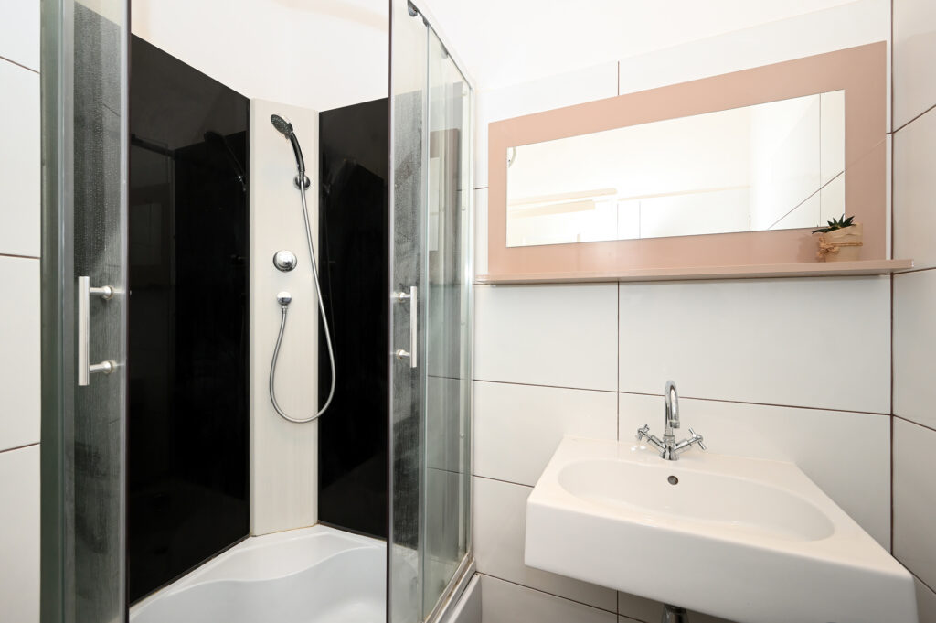 Dispozici doplňuje prostorný obývací pokoj, kuchyňský kout a druhá menší koupela se sprchovým koutem a pračkou. Kuchyně je vybavena kuchyňskou linkou s plynovým sporákem, digestoří, el. troubou, myčkou a lednicí s mrazákem. Byt je orientován do tichého vnitrobloku a klidné ulice Karoliny světlé.