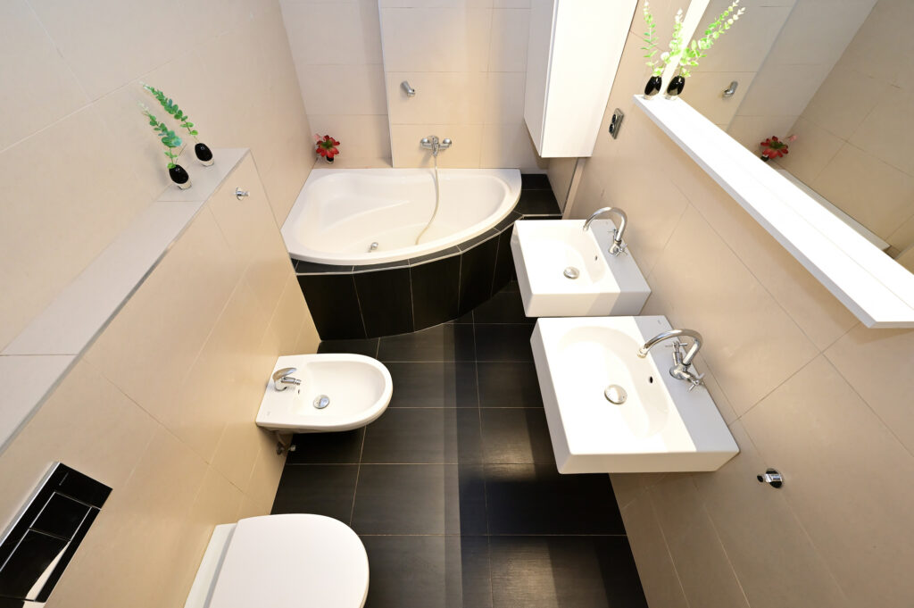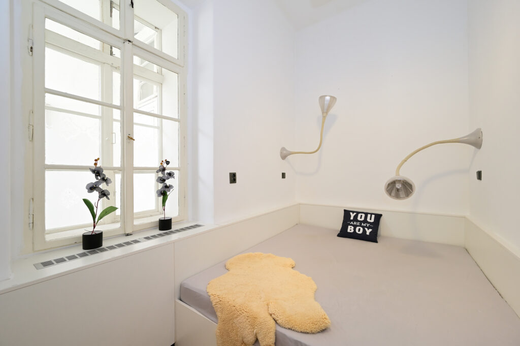 Byt sestávající se z vstupní předsíně s velkou šatní skříní, koupelny s rohovou vanou, závěsným WC, bidetem, dvěmi umyvadly, dvou menších pokojů a hlavní ložnice s hezkým výhledem do bočních ulic.