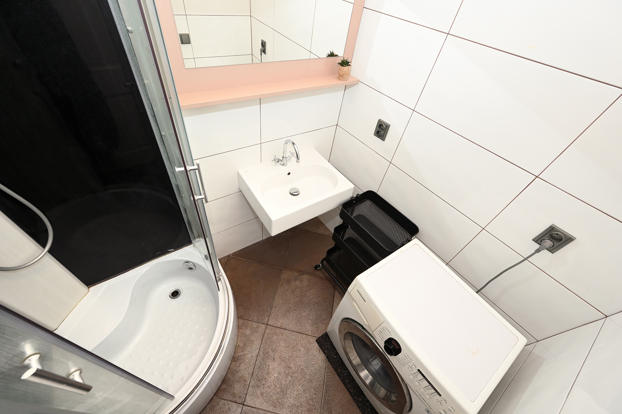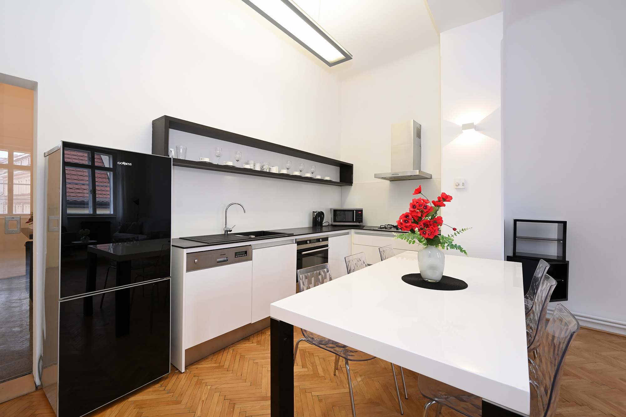 Dispozici doplňuje prostorný obývací pokoj, kuchyňský kout a druhá menší koupela se sprchovým koutem a pračkou. Kuchyně je vybavena kuchyňskou linkou s plynovým sporákem, digestoří, el. troubou, myčkou a lednicí s mrazákem. Byt je orientován do tichého vnitrobloku a klidné ulice Karoliny světlé.
