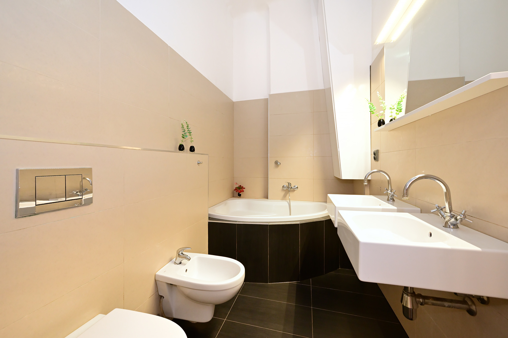 Byt sestávající se z vstupní předsíně s velkou šatní skříní, koupelny s rohovou vanou, závěsným WC, bidetem, dvěmi umyvadly, dvou menších pokojů a hlavní ložnice s hezkým výhledem do bočních ulic.