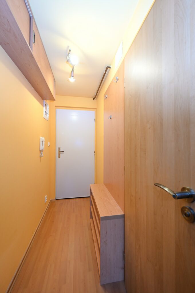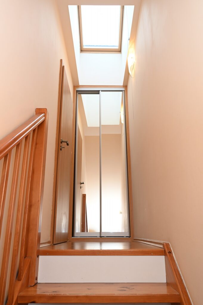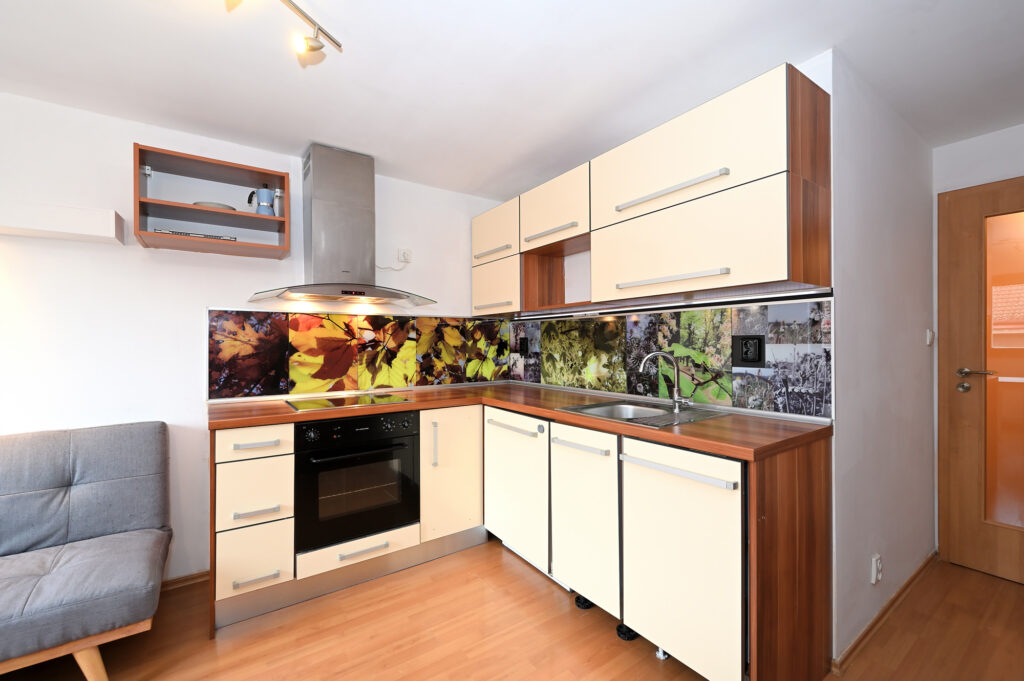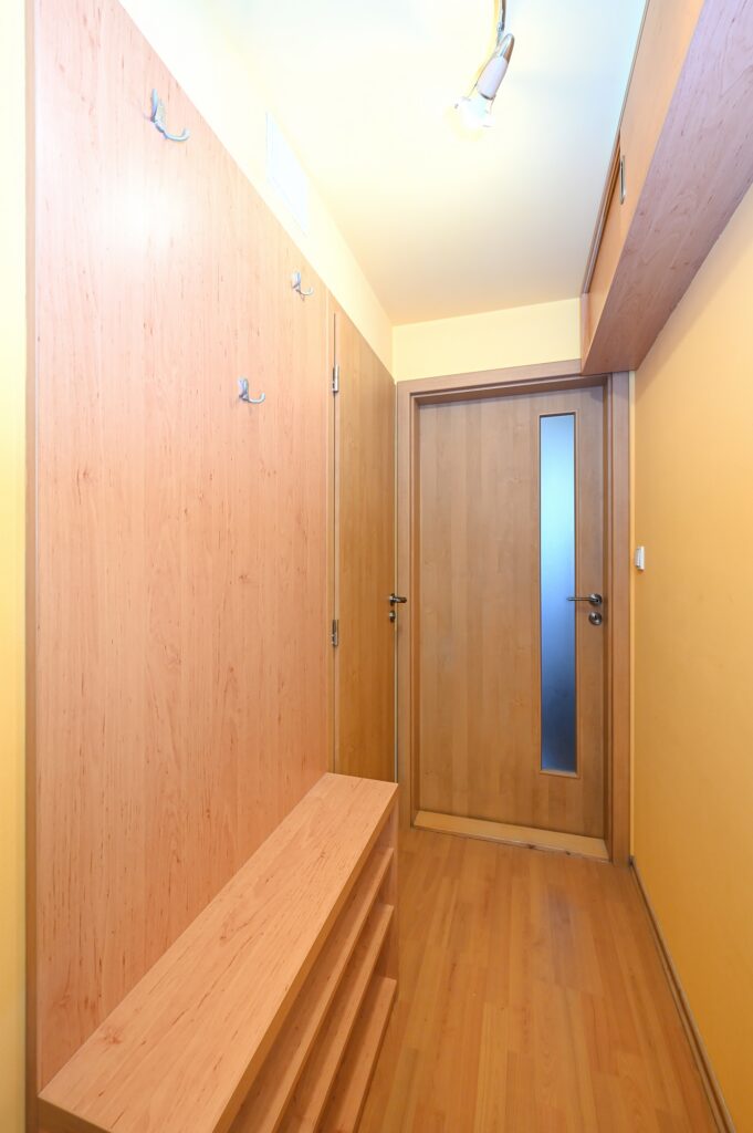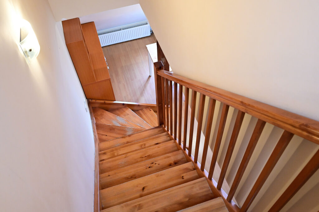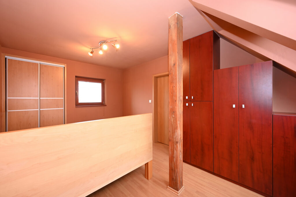 Přízemí bytu tvoří vstupní chodba, koupelna s toaletou a sprchovým koutem a obývací pokoj s kompletně vybaveným kuchyňským koutem (velká lednice s mrazákem, myčka, el. trouba, varná deska, digestoř a pračka). V prvním patře bytu se nachází chodba s vestavěnou šatní skříní a ložnice s manželskou postelí a skříněmi s dostatkem úložných prostor.