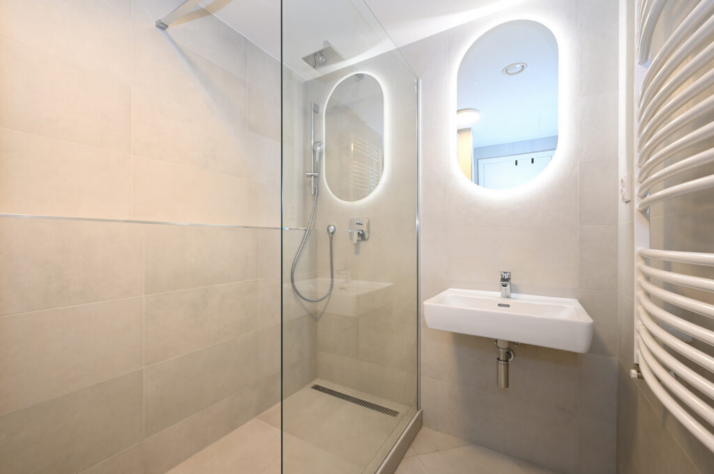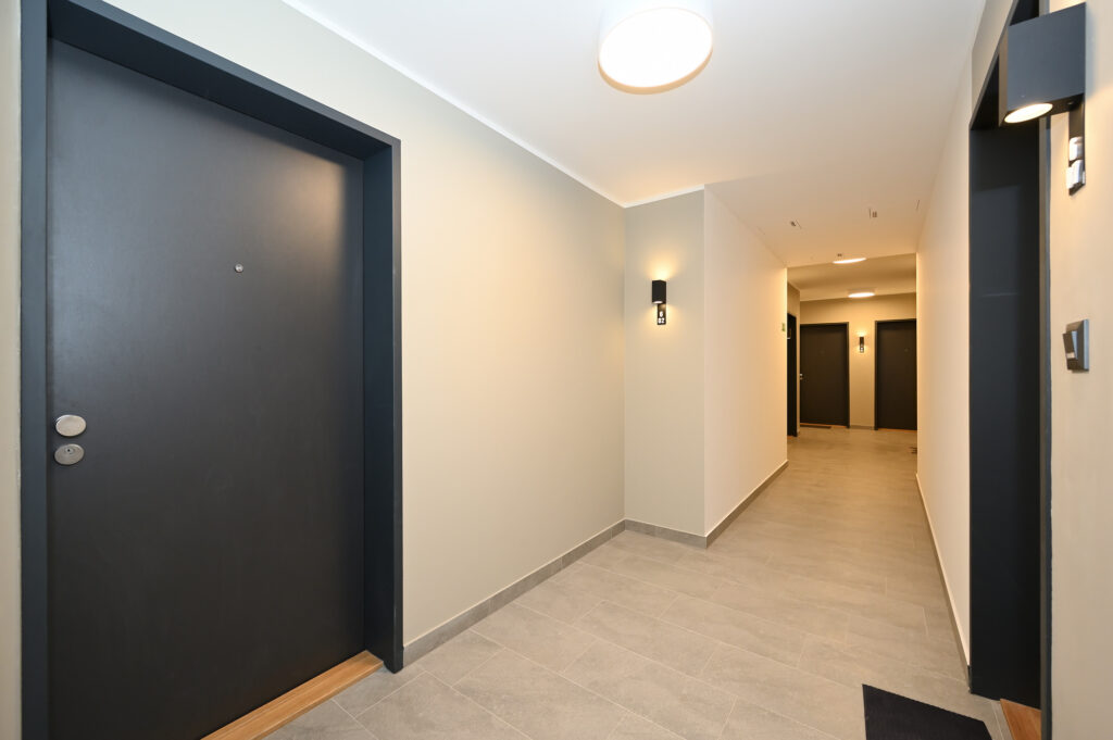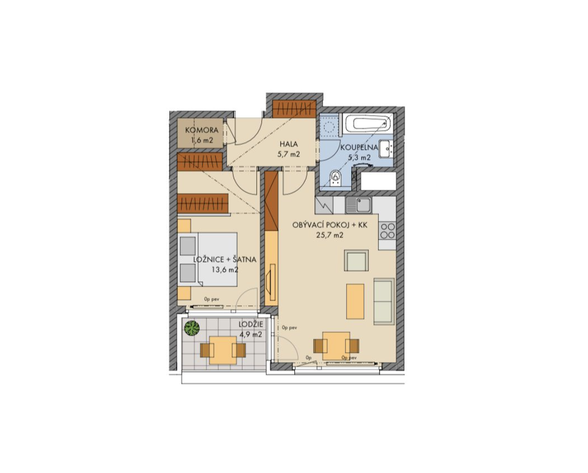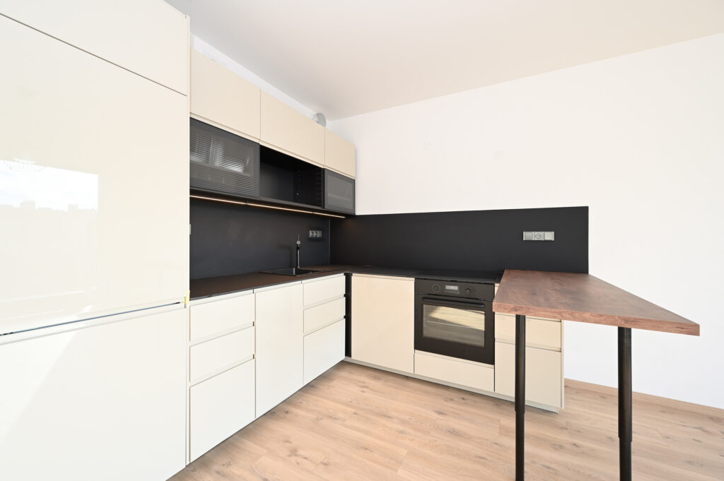 Byt se skládá z vstupní chodby, komory, koupelny se sprchovým koutem walk in a toaletou, ložnice s menší pracovnou nebo šatnou, obývacího pokoje s kuchyňským koutem a lodžie, která je přístupná jak z ložnice, tak z obývacího pokoje. Velkoformátová francouzská okna, doplněná elektrickými roletami, jsou dominantou celého bytu. Kuchyně je vybavena novými a kvalitními spotřebiči, jako jsou elektrická trouba, varná deska, digestoř, myčka a vestavěná lednice s mrazákem. Byt nabízí mnoho nadstandardních prvků, jako jsou dřevěné podlahy, moderní radiátory, speciální komorové dveře a upravený sprchový kout.
