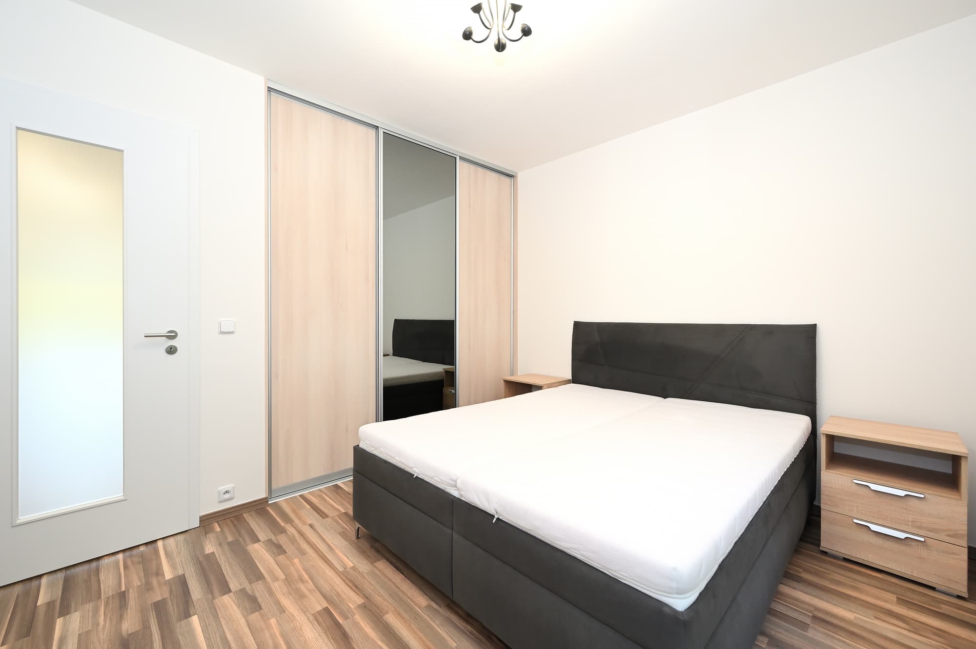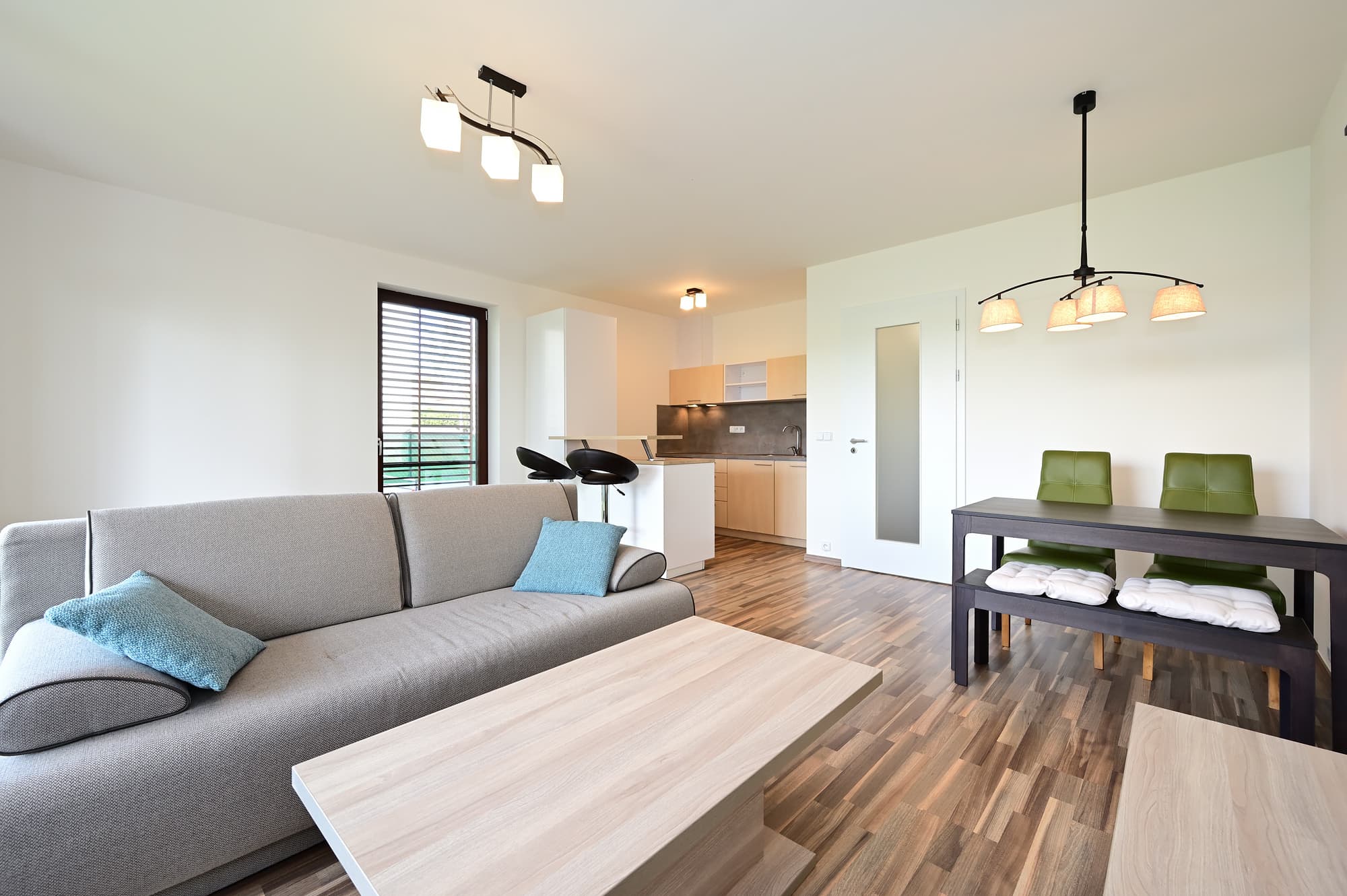 Byt je nabízen k pronájmu kompletně zařízený, včetně kuchyňské linky vybavené kvalitními spotřebiči, jako jsou elektrická trouba, sklokeramická varná deska, digestoř, myčka nádobí a lednice s mrazákem. V obývacím pokoji je k dispozici jídelní stůl se židlemi, sedací souprava, konferenční stolek, barové židle a menší obývací stěna. V ložnici se nachází manželská postel s nočními stolečky, vestavěná šatní skříň a komoda.