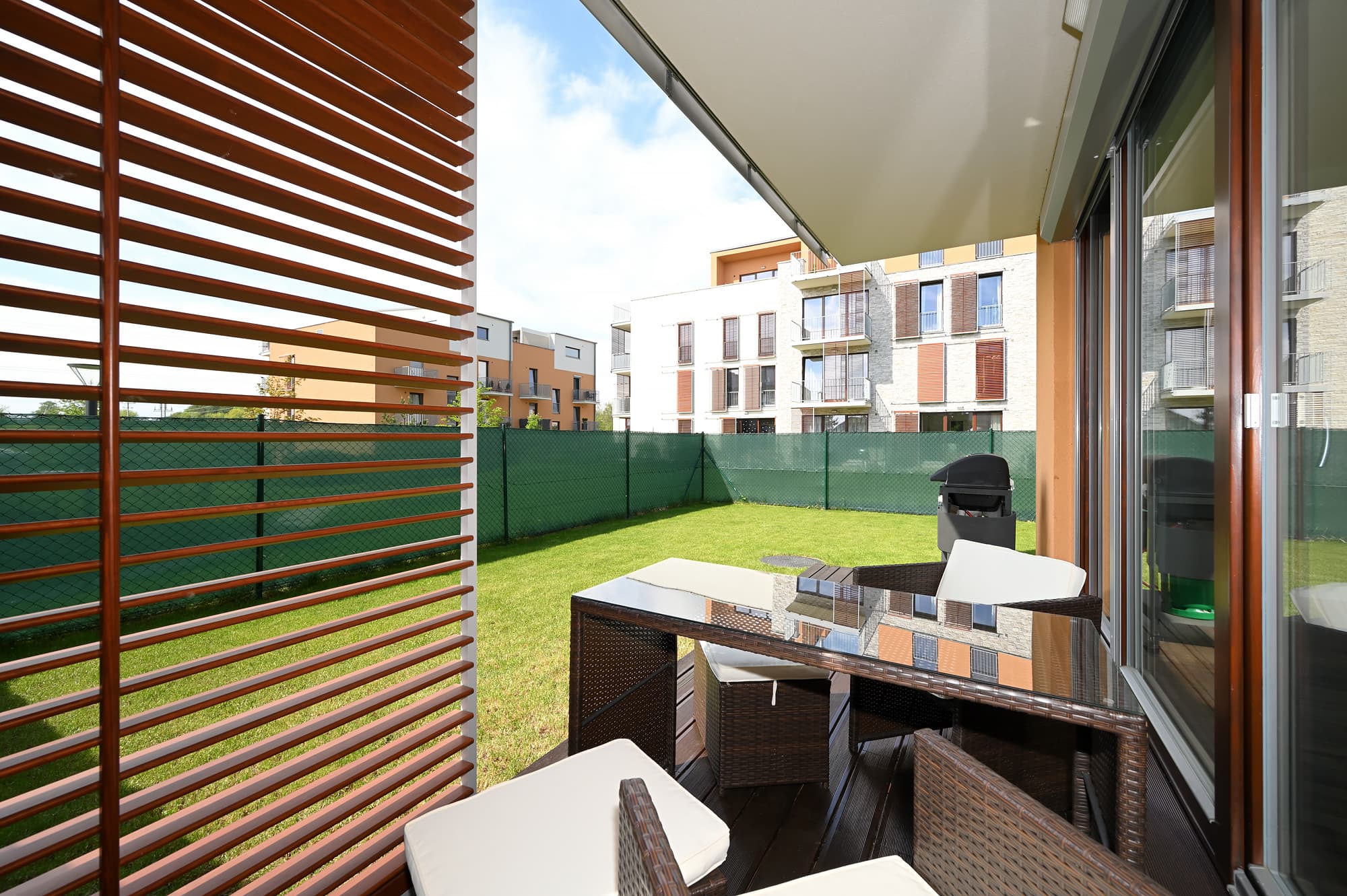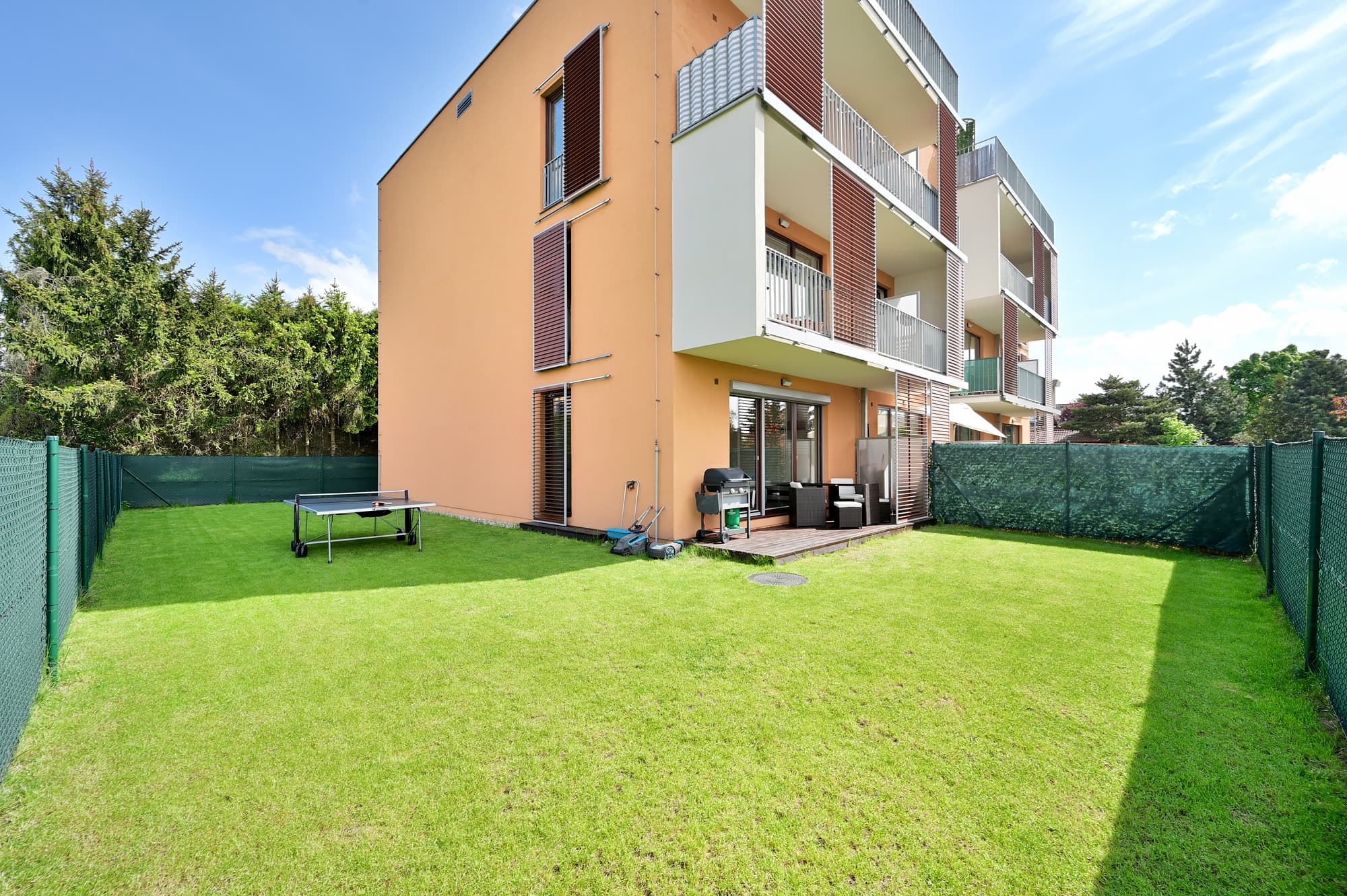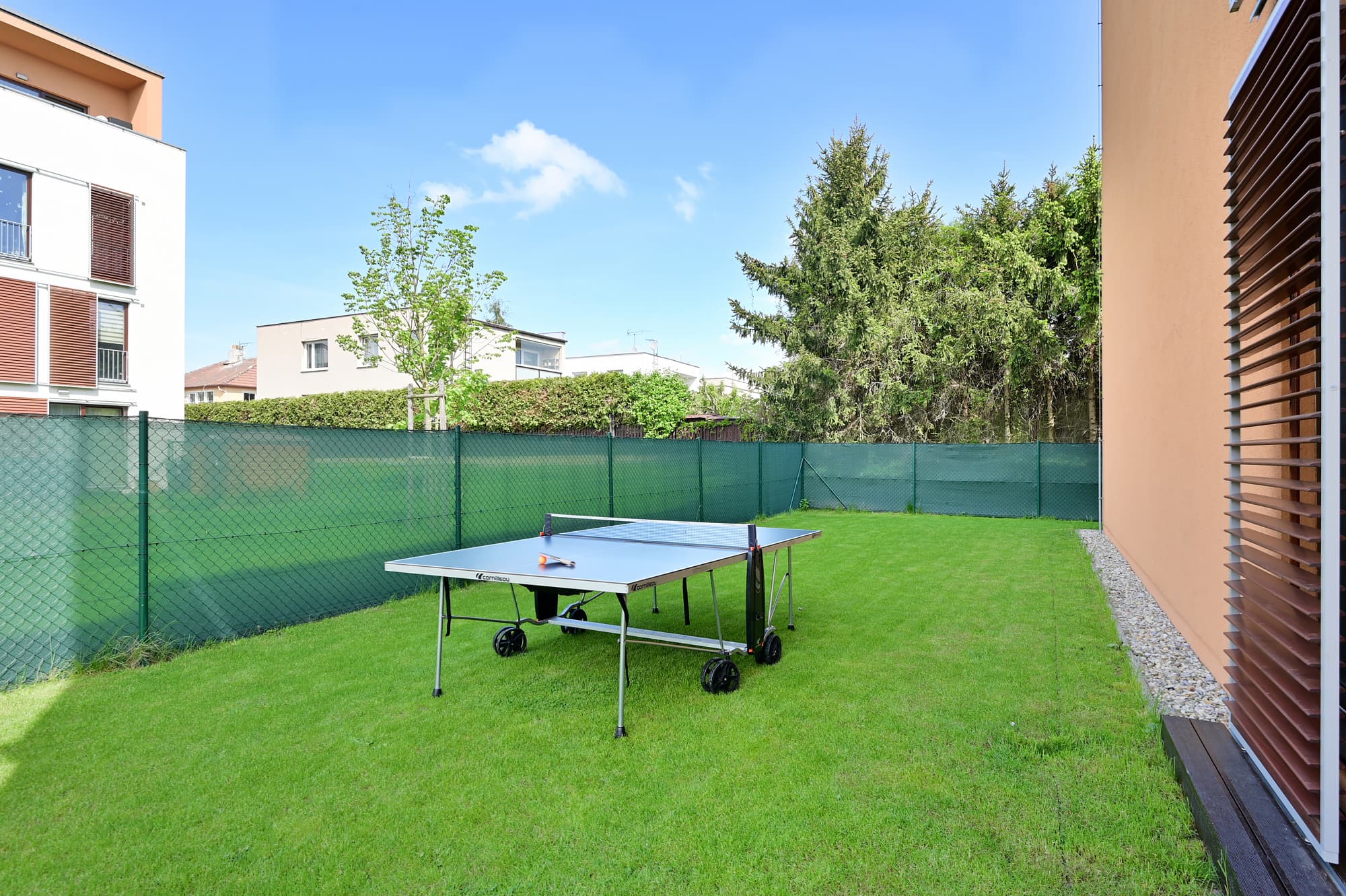 Velká zahrada nabízí nejen posezení na zastřešené terase, ale také možnost grilování s přáteli a hraní ping-pongu. O sekání zahrady se stará robotická sekačka a pro aktivní jedince je k dispozici ruční sekačka. Majitel nemovitosti vítá domácí mazlíčky, což zvýrazňuje vhodnost zahrady pro klienty s pejskem. Další výhodou bytu jsou velkoformátová francouzská okna, která jsou vybavena elektrickými roletami.