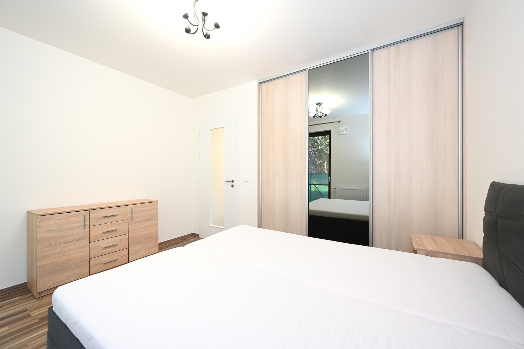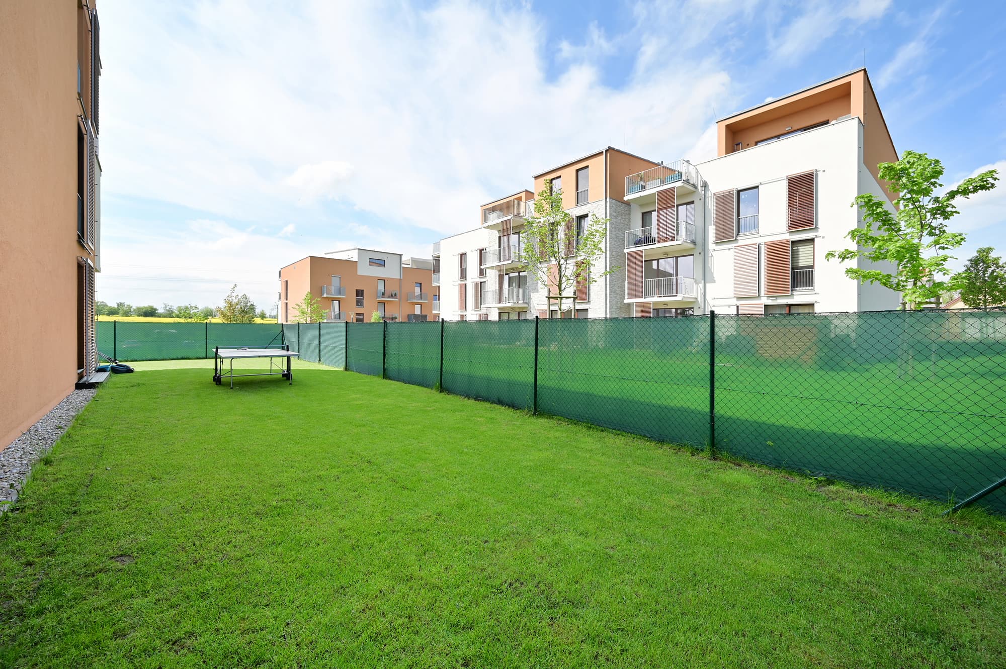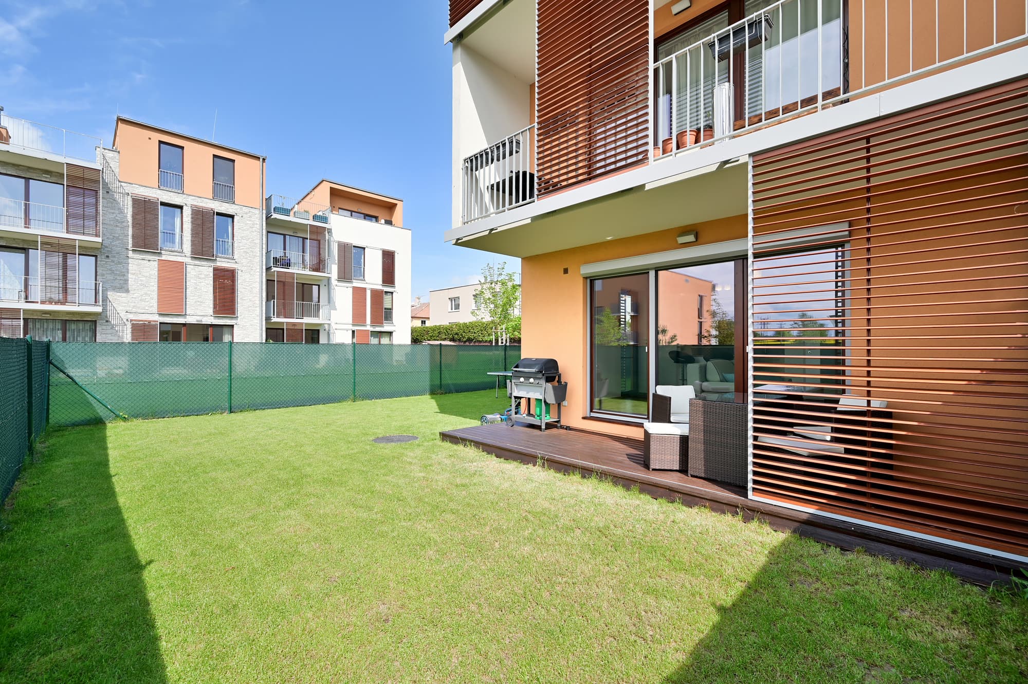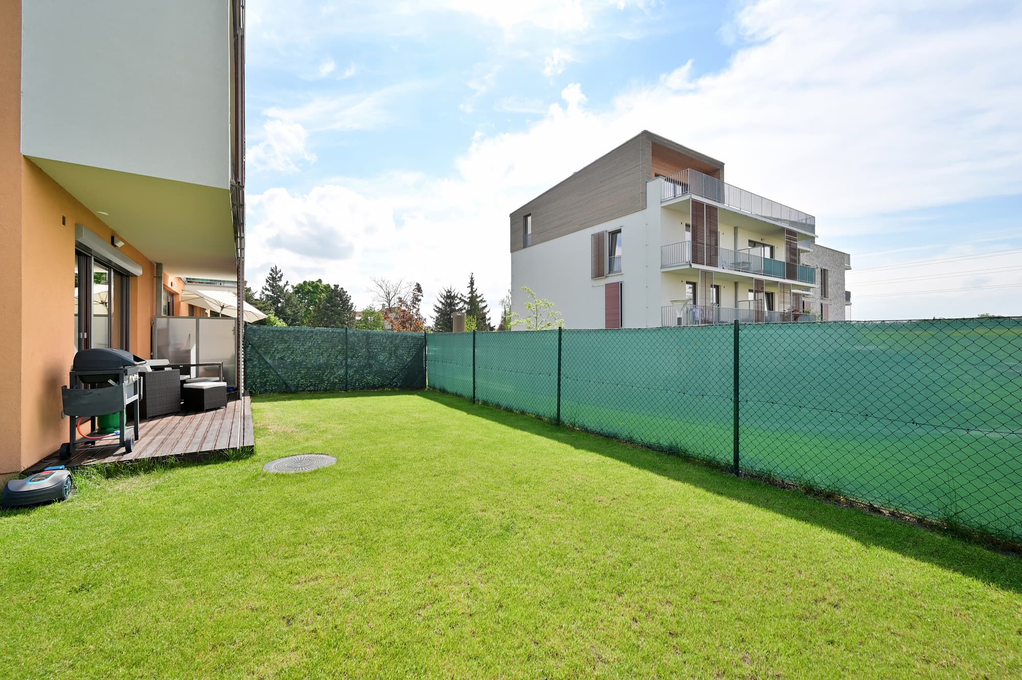 Velká zahrada nabízí nejen posezení na zastřešené terase, ale také možnost grilování s přáteli a hraní ping-pongu. O sekání zahrady se stará robotická sekačka a pro aktivní jedince je k dispozici ruční sekačka. Majitel nemovitosti vítá domácí mazlíčky, což zvýrazňuje vhodnost zahrady pro klienty s pejskem. Další výhodou bytu jsou velkoformátová francouzská okna, která jsou vybavena elektrickými roletami.