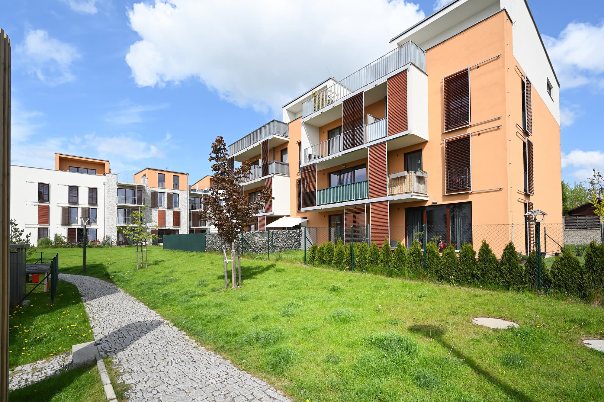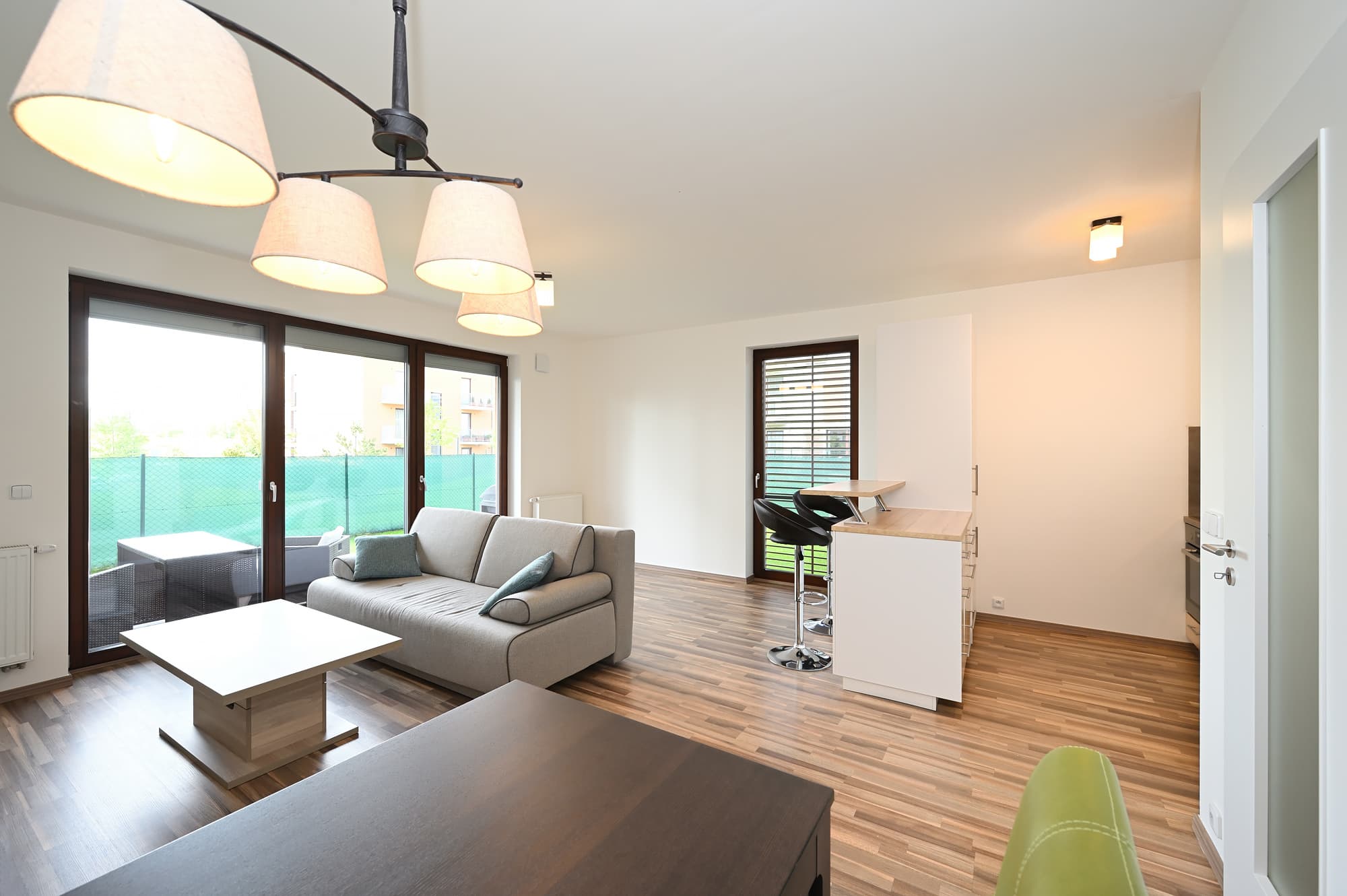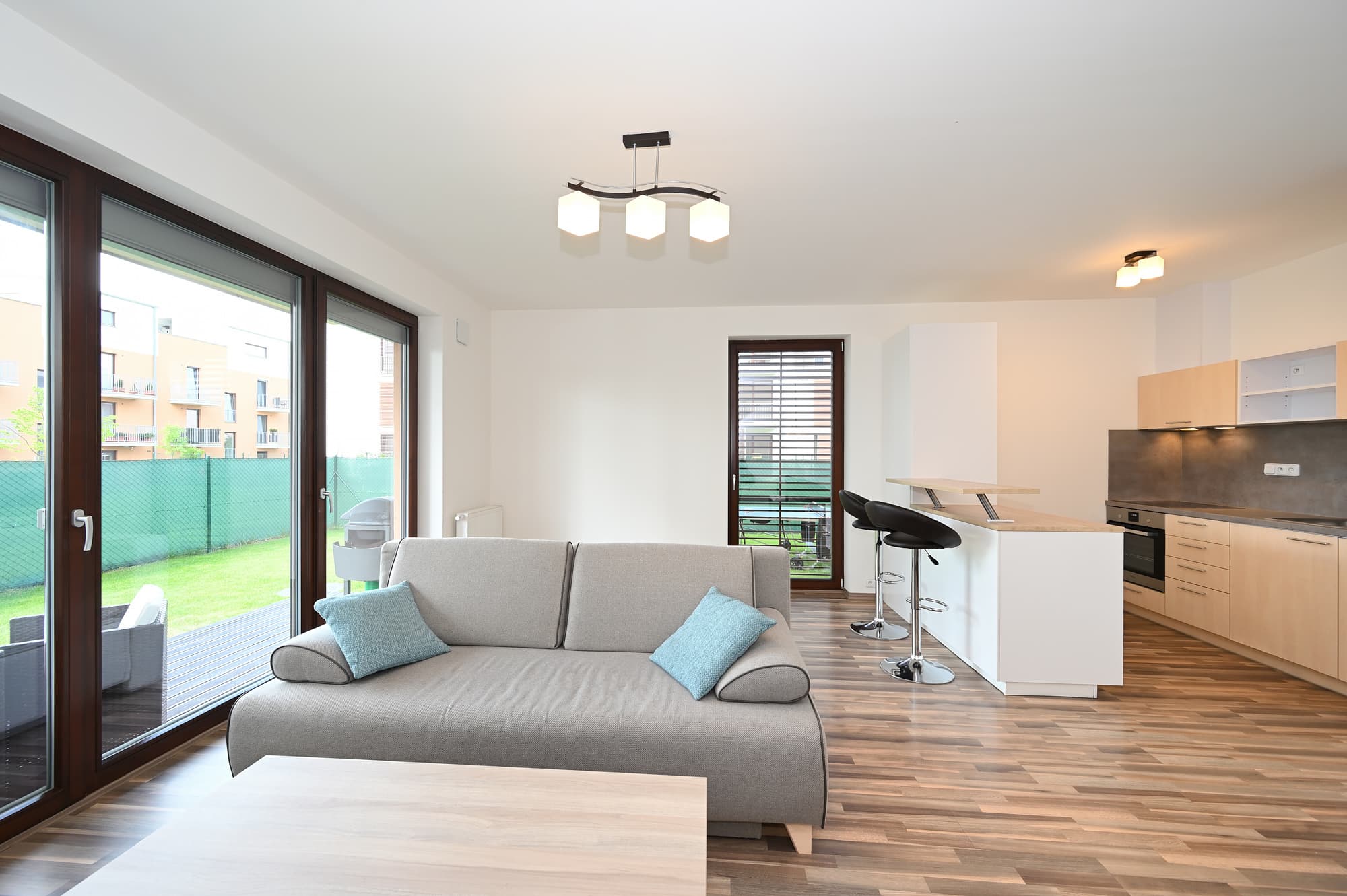 PRONAJATO – Moderní a kompletně zařízený byt v rezidenčním projektu Bažantnice, 2+kk, 56 m² s vlastní zahradou 183 m², 1 venkovní park. stání, sklep, ul. Dubová, Hostivice