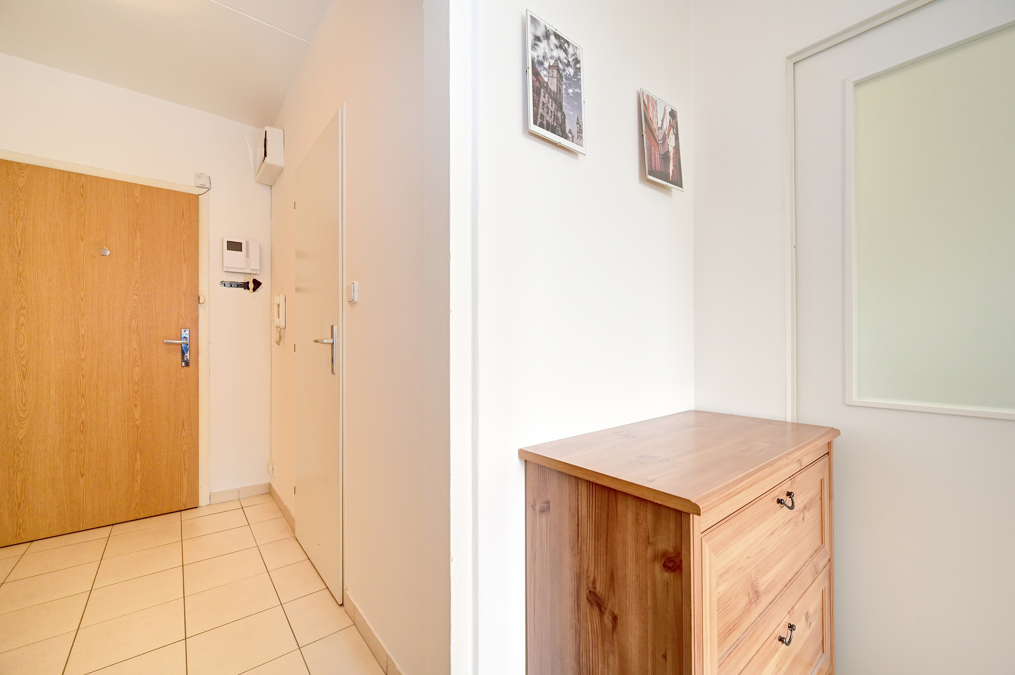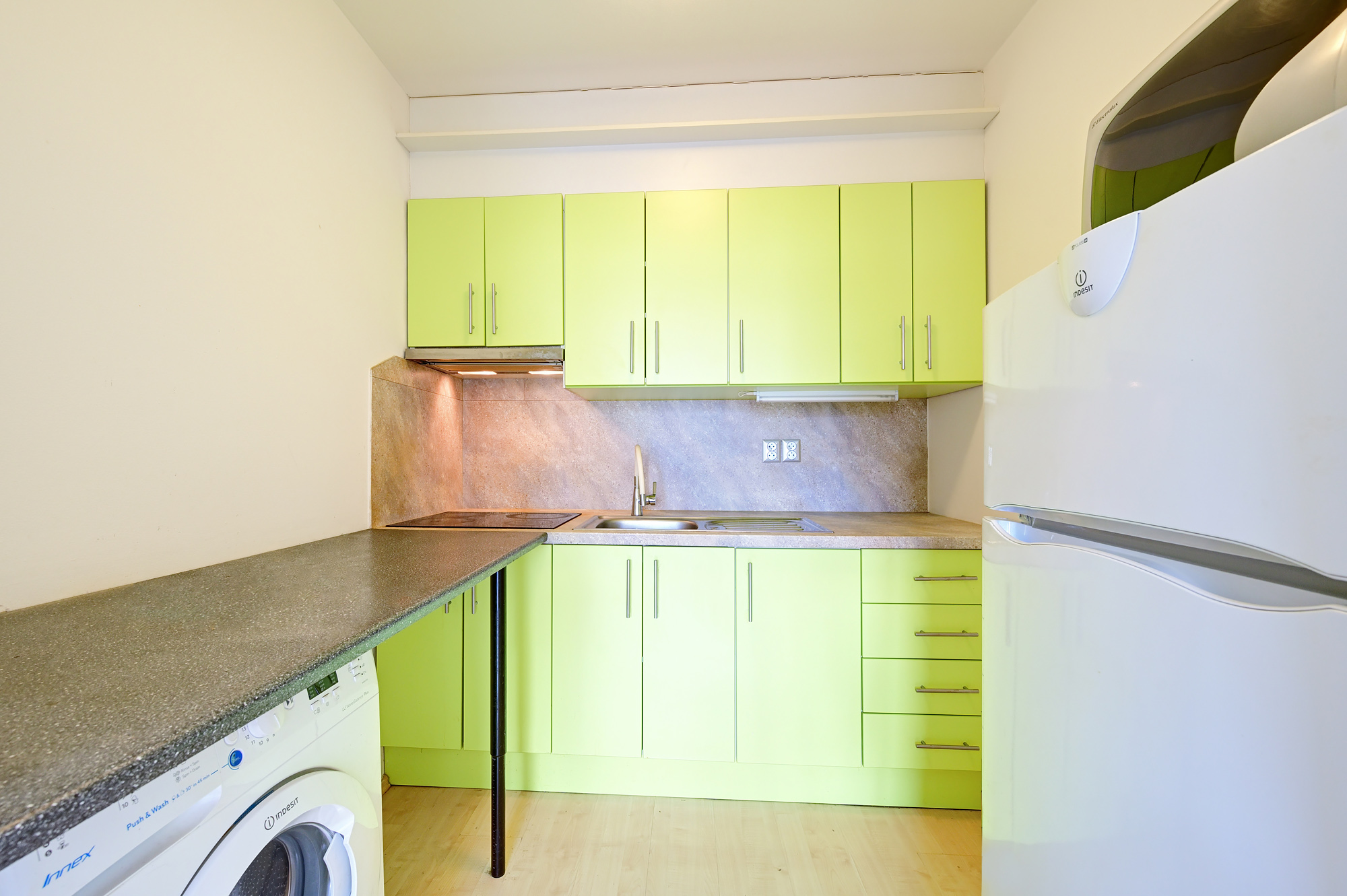 Bytová jednotka se skládá z neprůchozí ložnice (10,2 m²), obývacího pokoje s kuchyňským koutem (21,3 m²), koupelny s vanou a toaletou (3,1 m²) a předsíně (6,8 m²). K bytu také náleží sklep (4,4 m²), který se nachází v suterénu domu. Kuchyňská linka je vybavena troubou, varnou deskou, digestoří, pračkou a lednicí s mrazákem.