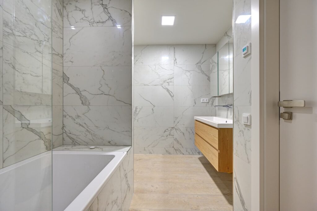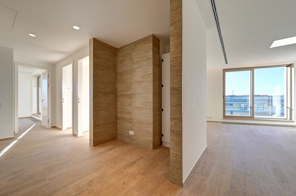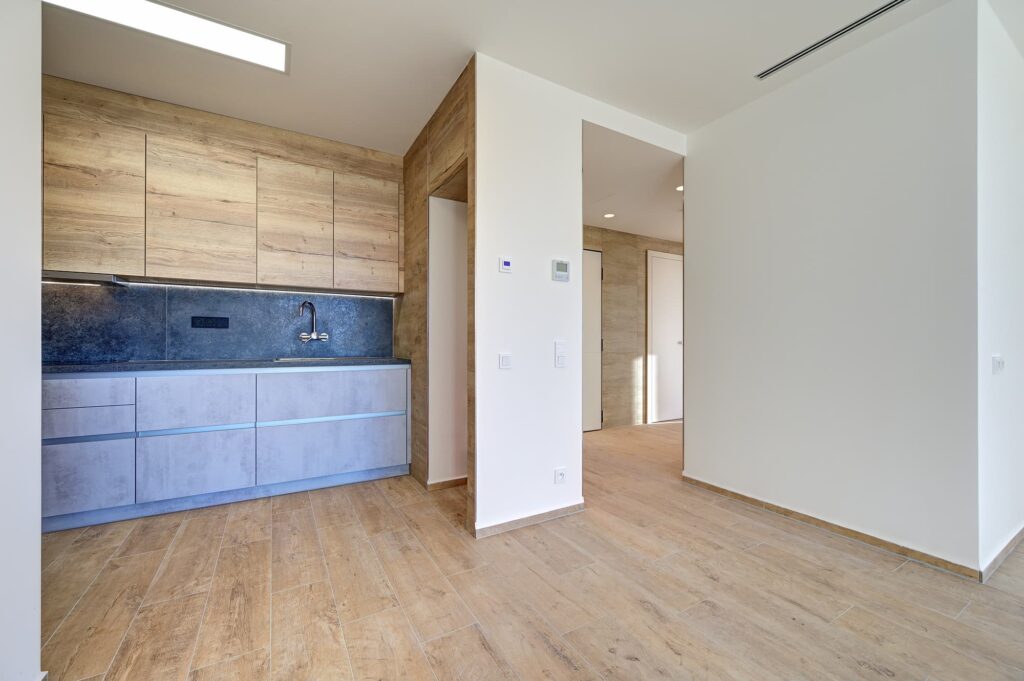 Byt se skládá z prostorného obývacího pokoje se vstupem na terasu a plně vybaveným kuchyňským koutem s kvalitními spotřebiči značky Electrolux (myčka na nádobí, elektrická trouba, indukční varná deska, mikrovlnná trouba a digestoř). Kromě toho má byt 2 prostorné ložnice, z nichž každá má přístup na terasu. Koupelna je ve vysokém standardu, co se týče kvality obkladů, dlažby a dodaného vybavení, jako jsou vana, dvojumyvadla a další prvky. Toaleta je samostatná a obsahuje závěsné WC a umyvadlo.