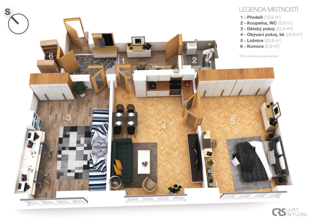 Byt je dispozičně řešený jako 3+kk, je zde vstupní chodba (13,5 m²), obývací pokoj s kuchyňským koutem (24,9 m²), dvě samostatné ložnice (22,4 m² a 22,6 m²), koupelna se sprchovým koutem a toaletou (3,9 m²), a komora (0,9 m²). K bytu náleží sklepní kóje v suterénu domu (2 m²).